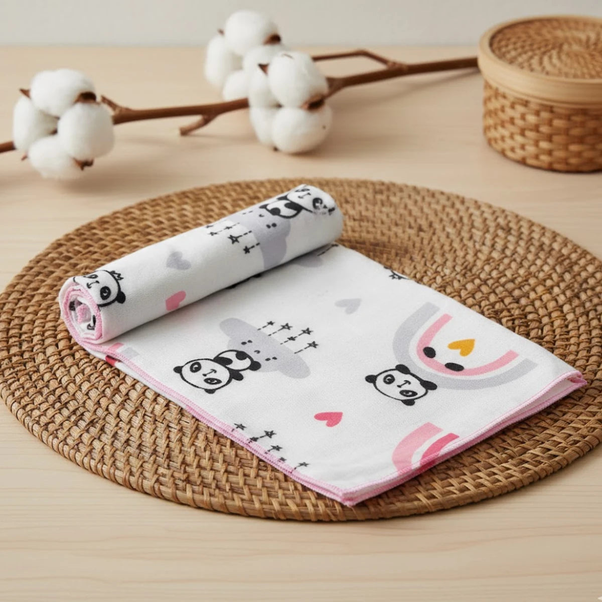 Бебешка памучна пелена от бархет Панда с панделка ще ви е необходима още от първите дни на бебето. Може да се слага на подложката за преповиване, като предпазна пелена между бебето и околния свят през първите месеци, като завивка през летните дни, по време на къпане, както и като защита върху коша за новородено или седалката на количката. Бебешката пелена е изработена от мека и деликатна памучна материя. Декорирана с нежен принт, от трайни и безопасни бои. Подходяща както за вкъщи, така и за разходка навън.