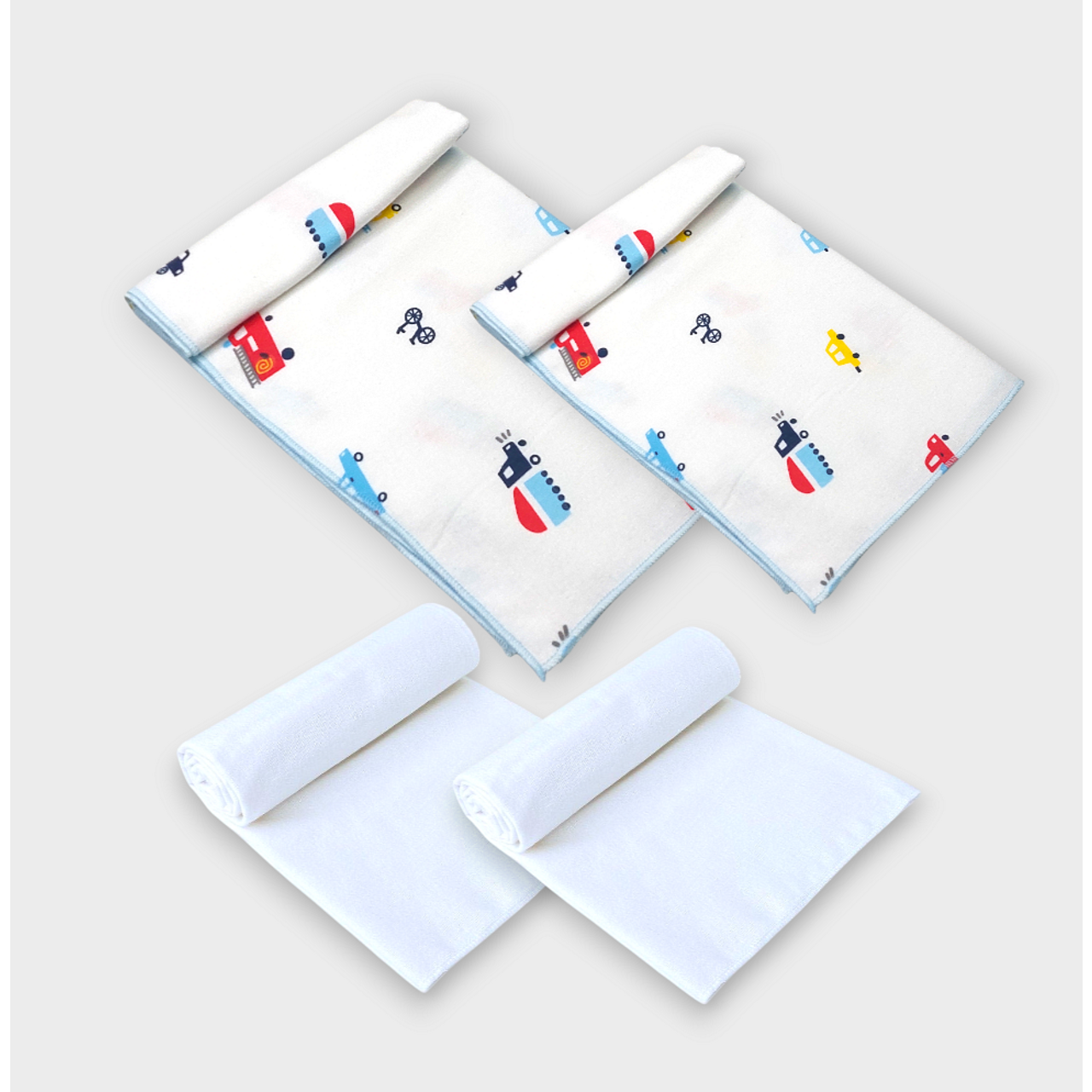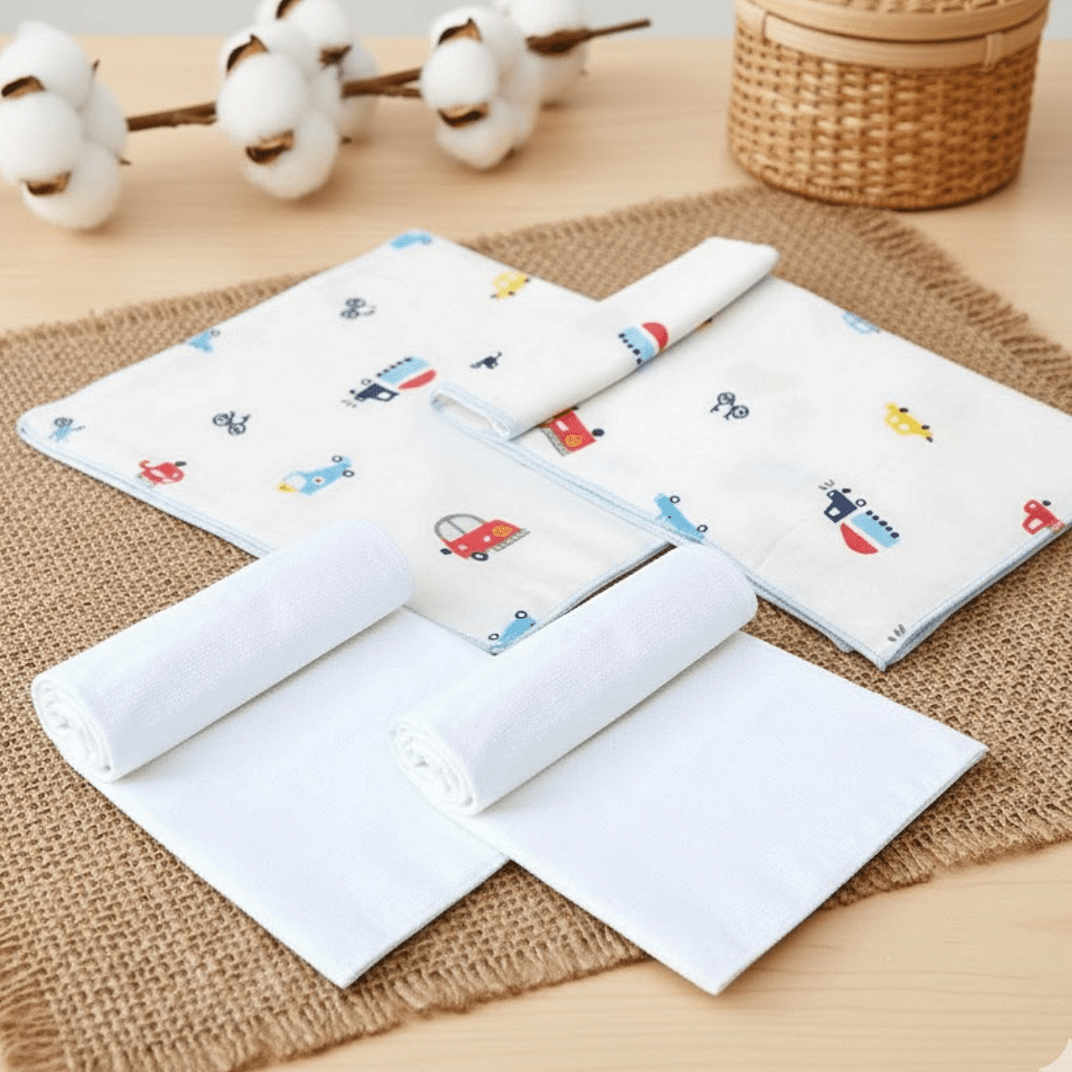 Комплект памучни пелени за бебе Бархет и Тензух 4 бр. Коли ще ви са необходими още от първите дни на бебето. Може да се слагат на подложката за преповиване, като предпазна пелена между бебето и околния свят през първите месеци, като завивка през летните дни, по време на къпане, както и като защита върху коша за новородено или седалката на количката. Бебешките пелени са изработена от мека и деликатна памучна материя. Декорирана с нежен принт, от трайни и безопасни бои. Подходяща както за вкъщи, така и за разходка навън.