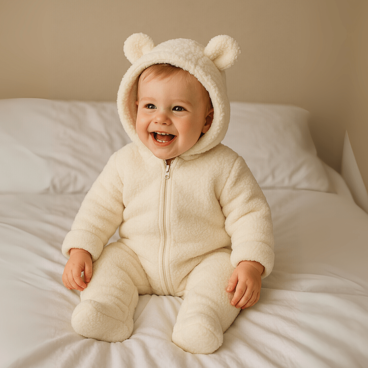 За малките любители на зимните приключения, "Rainy Бебешки зимен гащеризон Мече" е не просто дреха, а топъл прегръдка, която ще ги пази от студа. Изработен от 100% полиестер (ко-полар), този плюшен гащеризон е създаден да дарява уют и комфорт дори в най-хладните дни. Бежовият цвят придава класически и изискан вид, като същевременно допълва всяка зимна сцена със своята топлина.