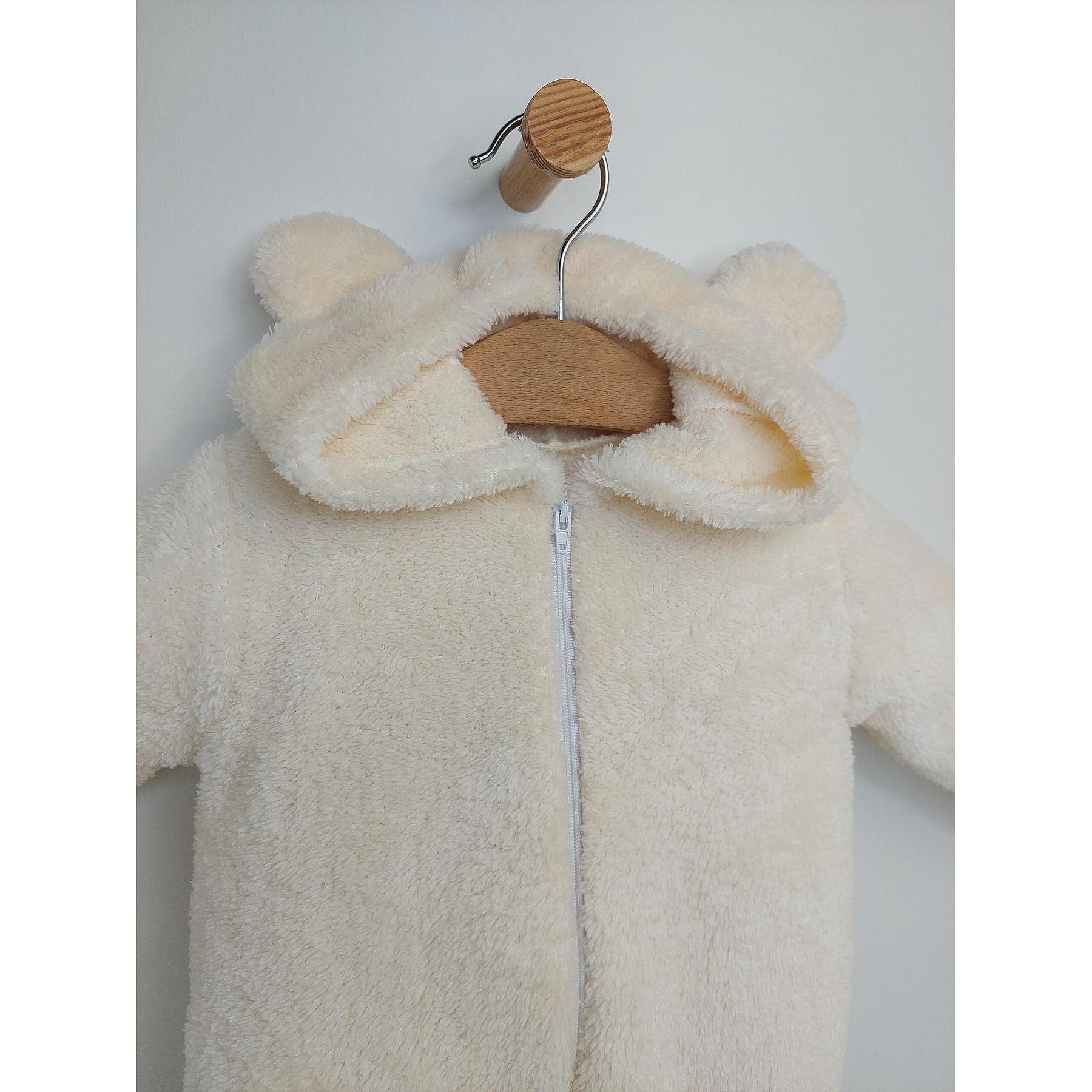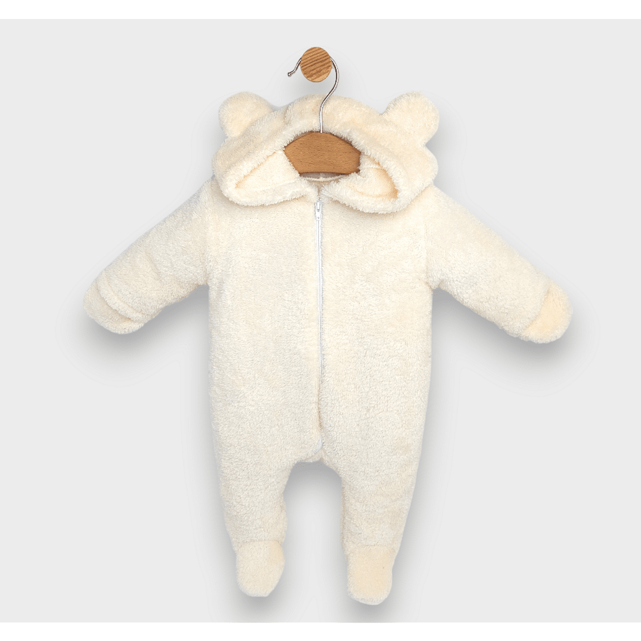 Бебешки зимен гащеризон Мече с ръкавички, предно закопчаване с цип и качулка с ушички Мече в цвят екрю.