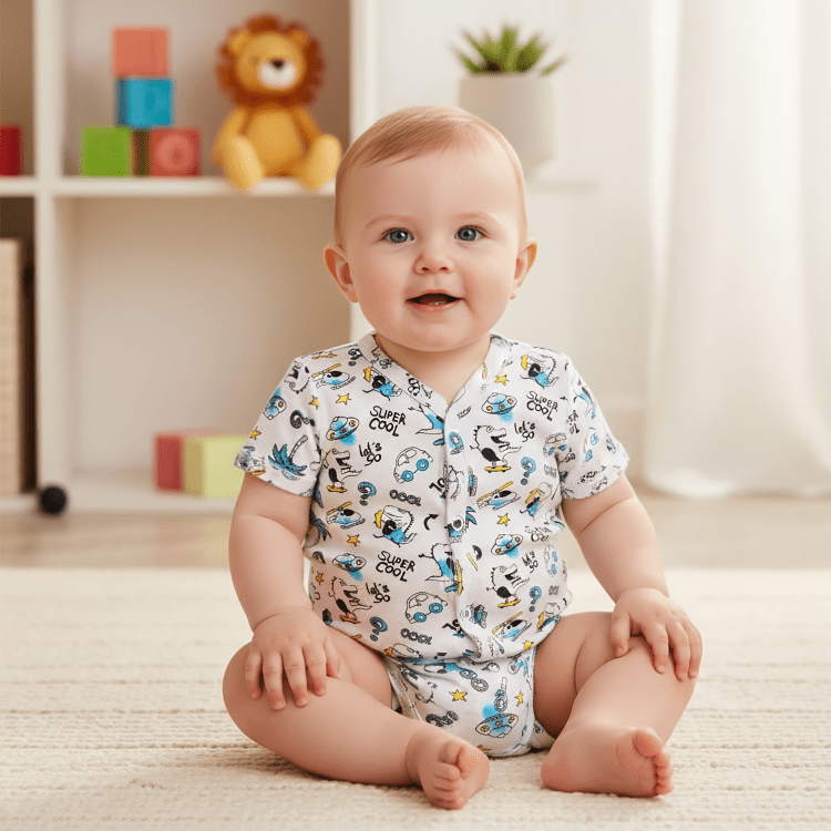 Създадено от мека и дишаща материя, бодито е нежно към чувствителната бебешка кожа, като предотвратява раздразнения и алергии. Предното закопчаване улеснява обличането и събличането, което е особено ценно по време на промените на пелените. Размерите варират от 48 до 62 см, което гарантира, че ще намерите перфектния размер за вашето растящо бебе.