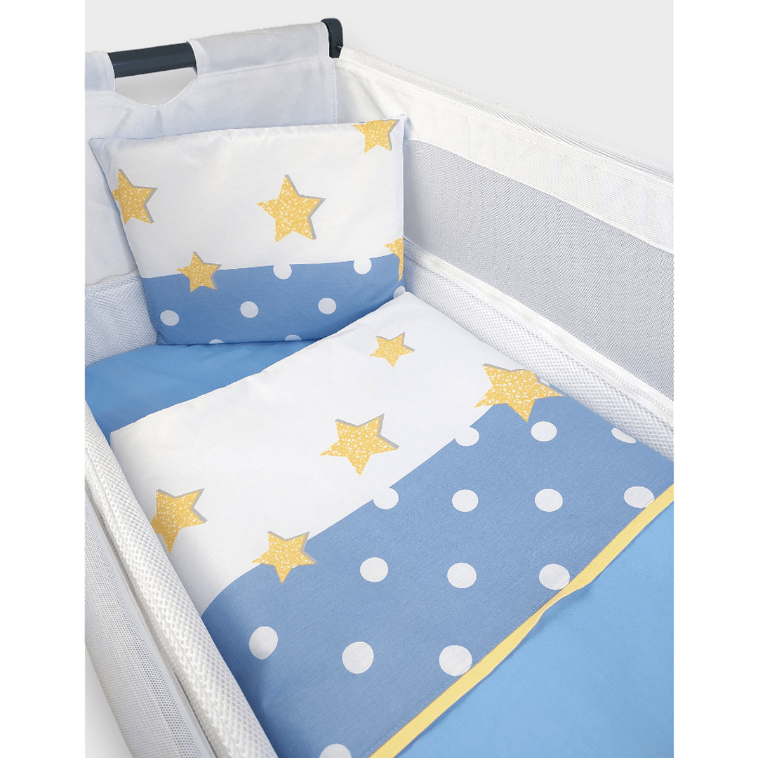 → Да – комплектите включват плоска възглавница и лека завивка, безопасни за малко бебе.