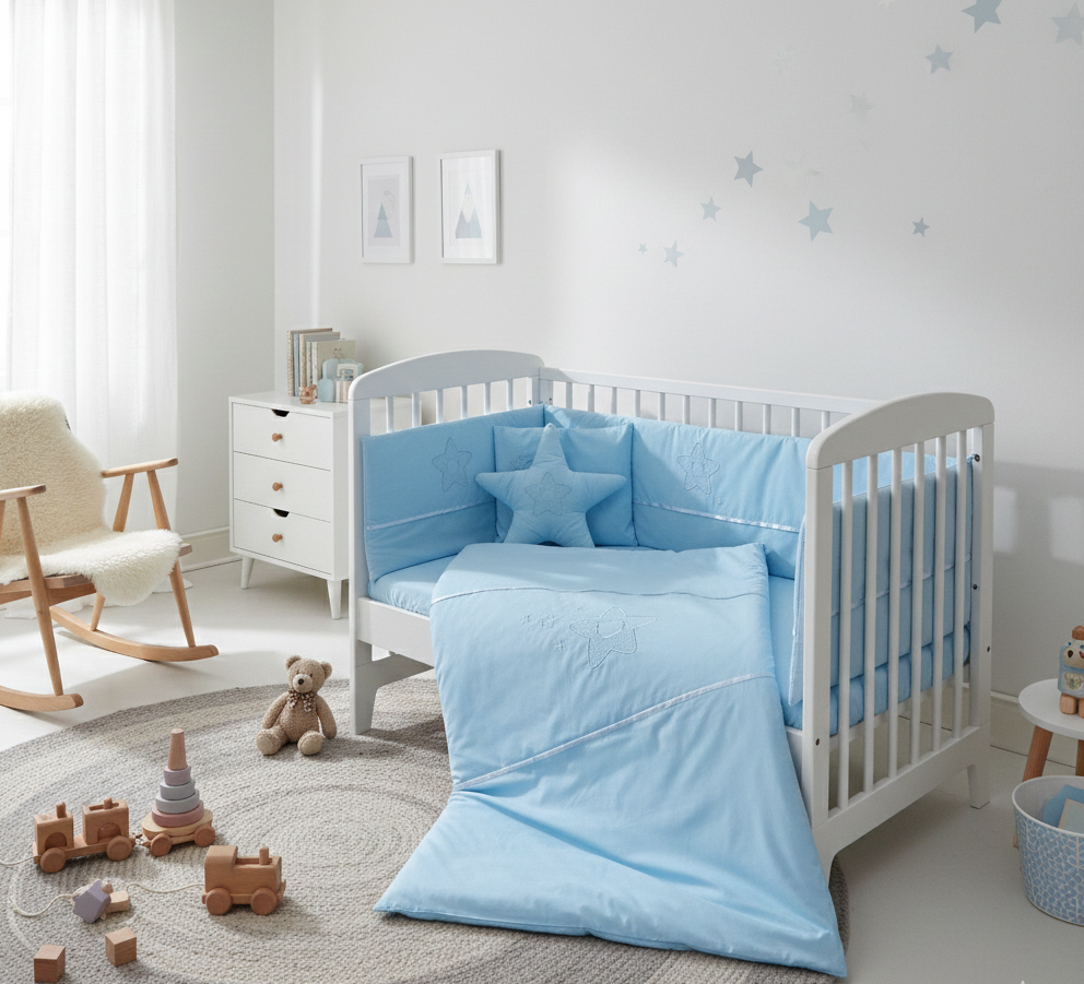 Бебешки спален комплект Звезда с мече е изработен от висококачествени материали в свежи цветове, които да внасят уют в детската стая. Дизайнът е стилен и оригинален. Комплекта ще пренесе малкото Ви съкровище в света на приказните сънища с лекота.