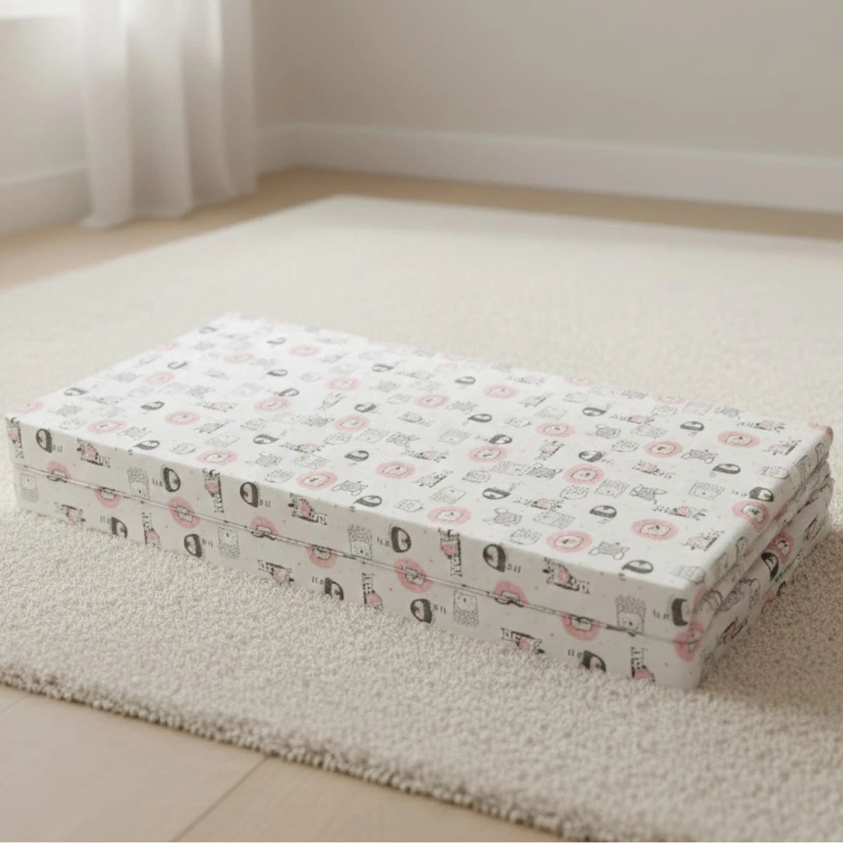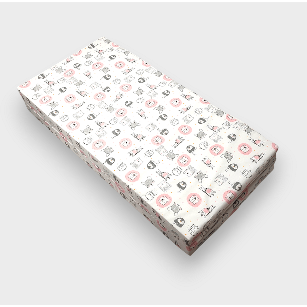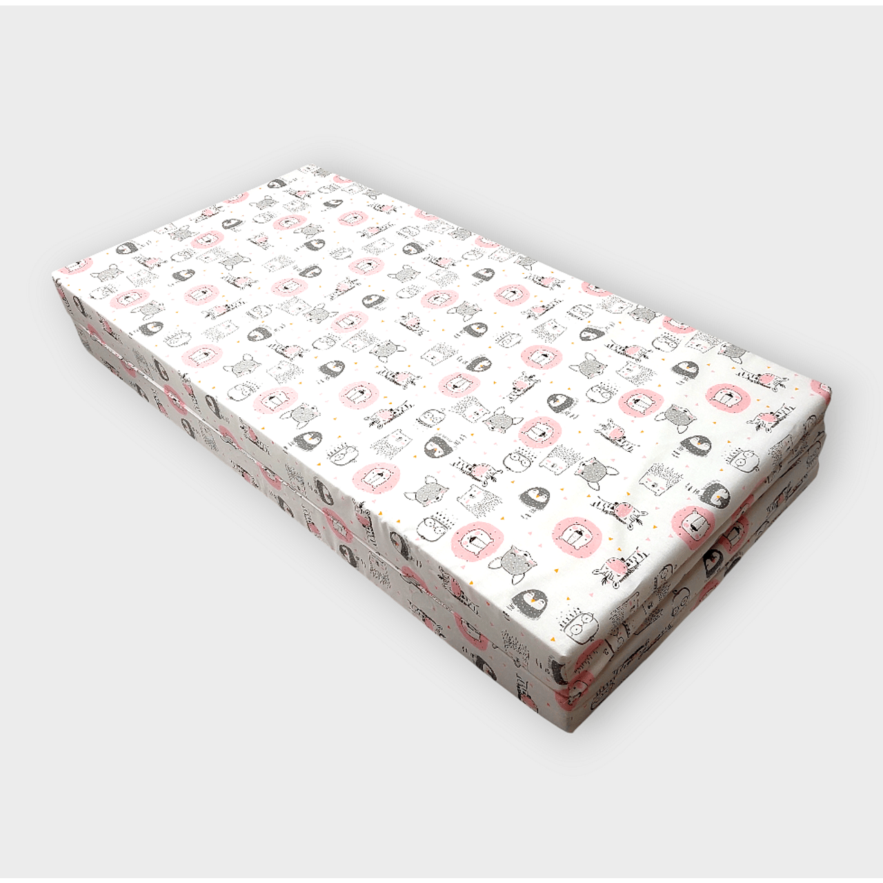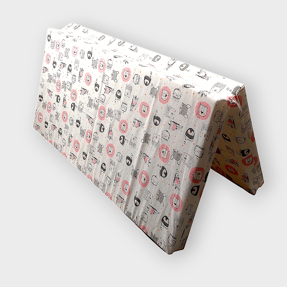 С размери 90х90 см, той е перфектен за малки пространства и лесно се сгъва, което го прави удобен за съхранение и пренасяне. С нежни и весели розови животинки, матракът не само че осигурява комфорт, но и добавя уют и радост в стаята на вашето дете.