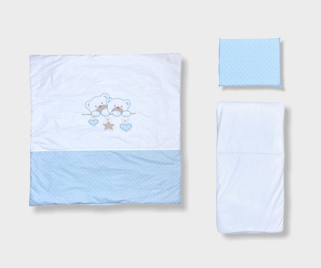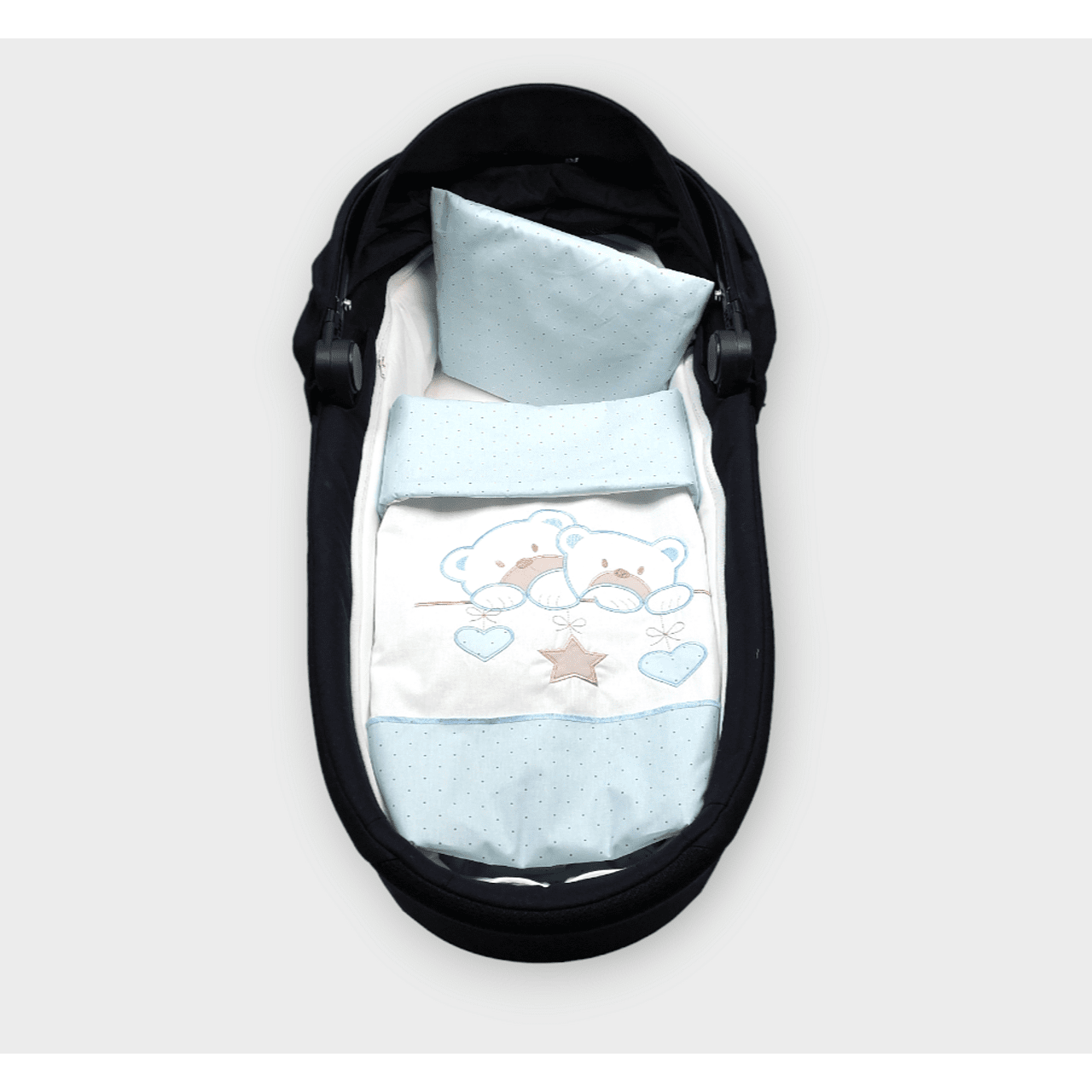 Комплект за бебешка количка от три части - подложка, възглавничка и ватирана пелена с бродерия Звездни мечета. Подходящ за всички бебешки колички, предпазва тапицерията, и осигурява комфорт на детето.