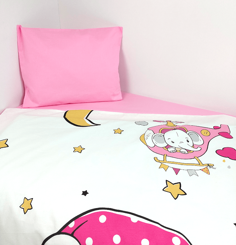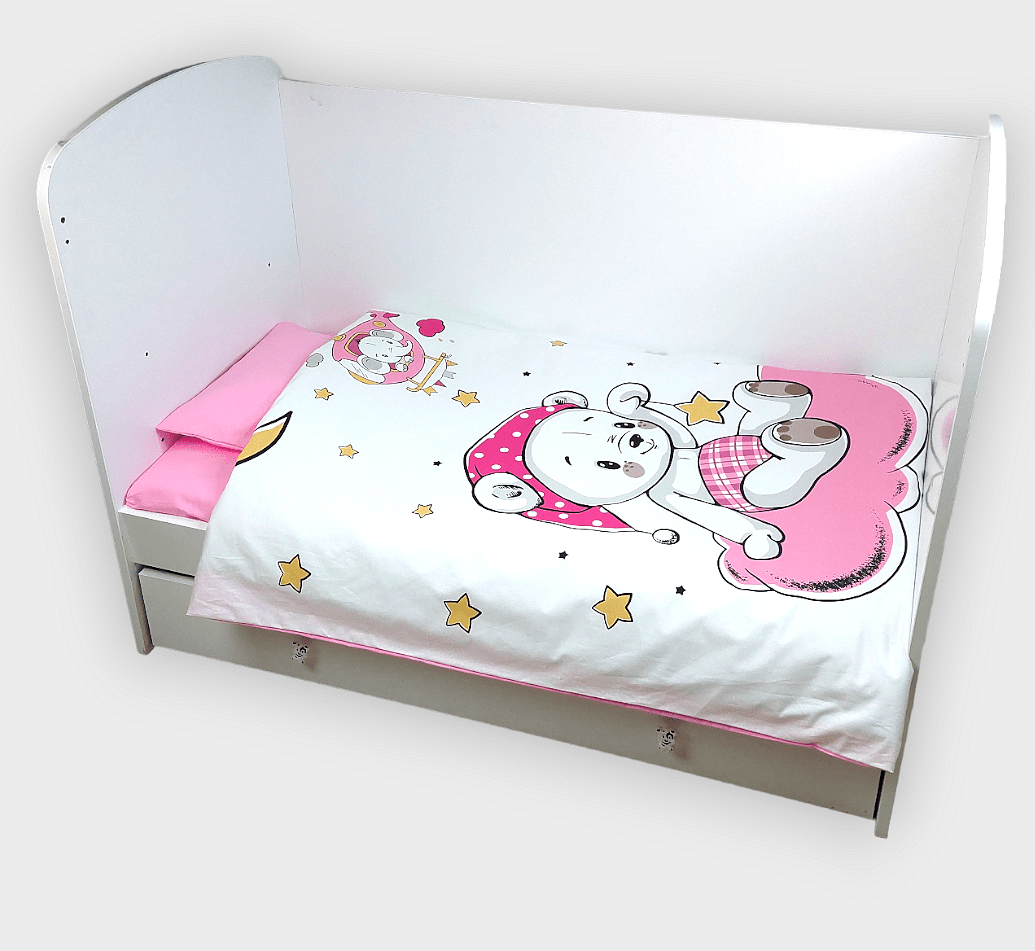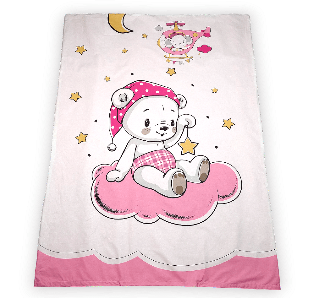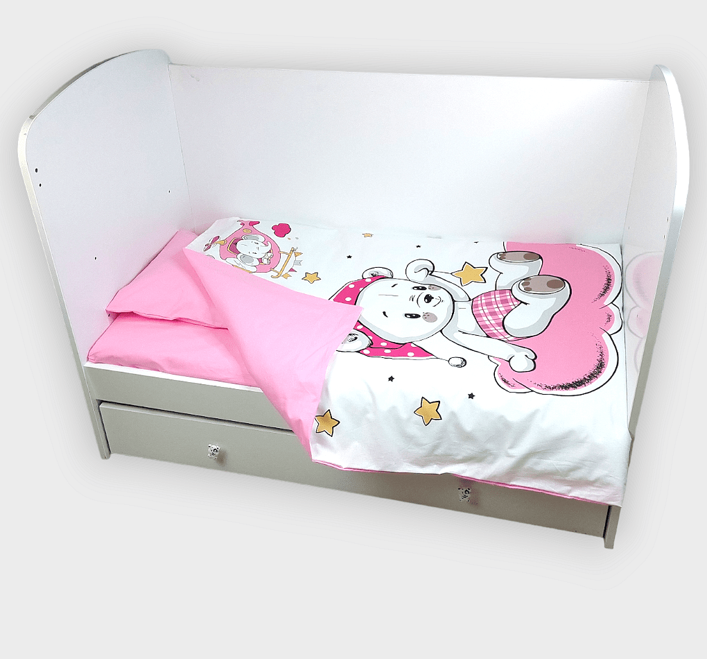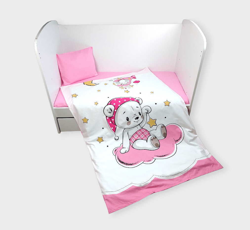 Бебешки спален комплект Розово мече е изработен от висококачествени материали в свежи цветове, които да внасят уют в детската стая. Дизайнът е стилен и оригинален. Комплекта ще пренесе малкото Ви съкровище в света на приказните сънища с лекота.