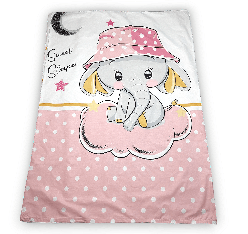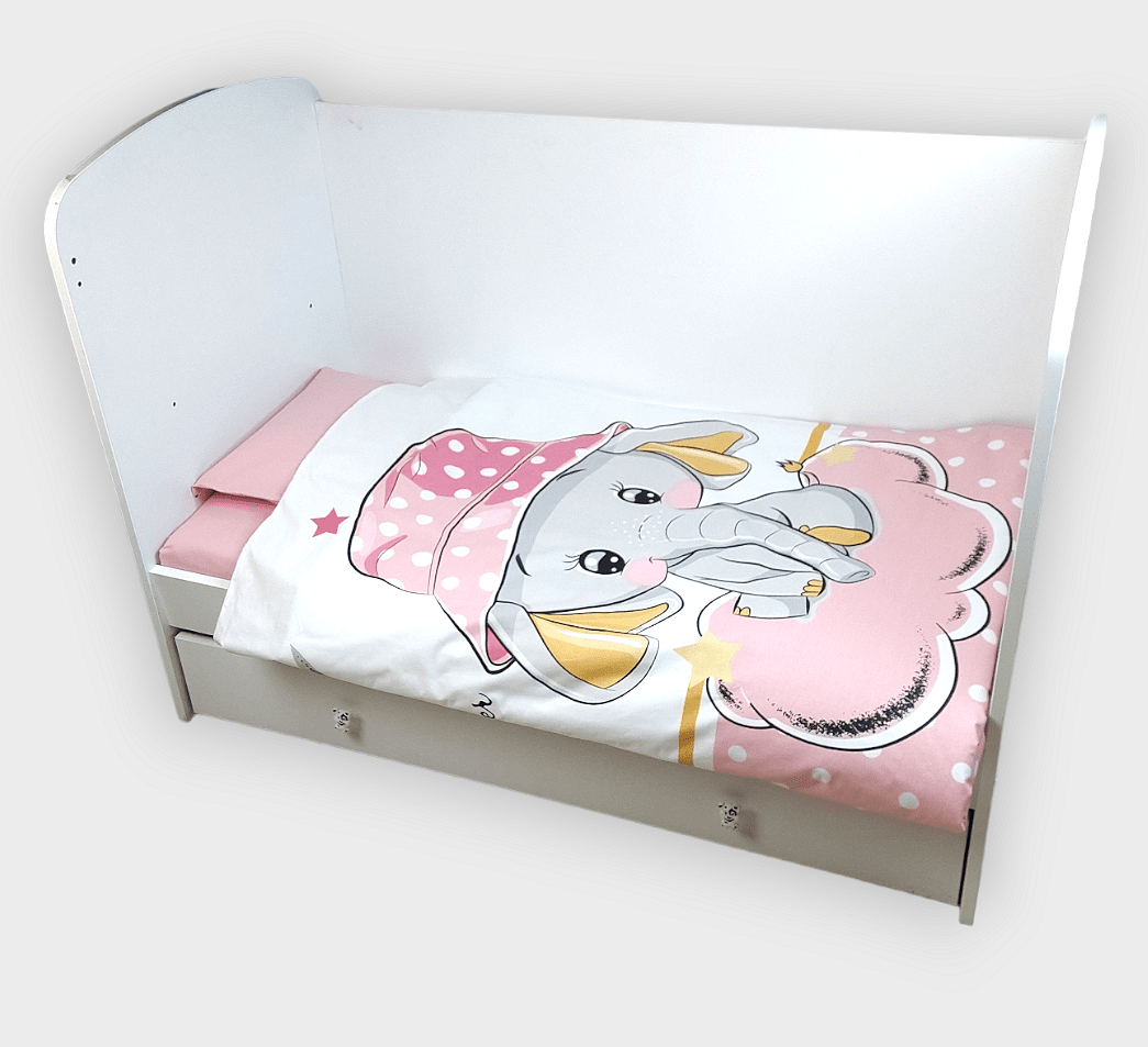 Бебешки спален комплект Розово слонче е изработен от висококачествени материали в свежи цветове, които да внасят уют в детската стая. Дизайнът е стилен и оригинален. Комплекта ще пренесе малкото Ви съкровище в света на приказните сънища с лекота.