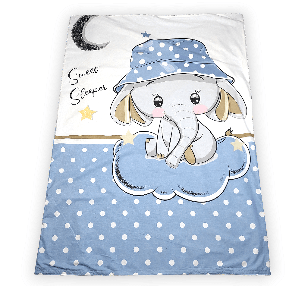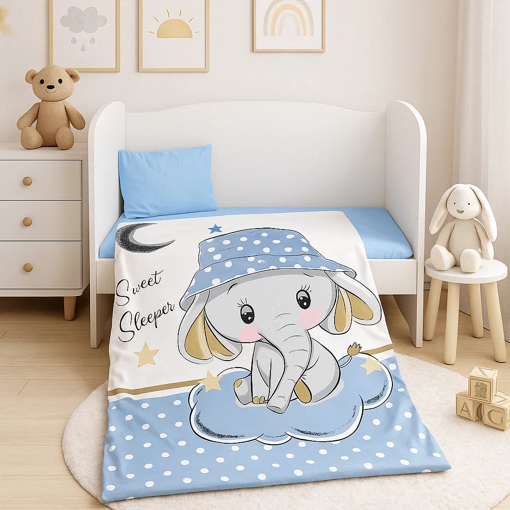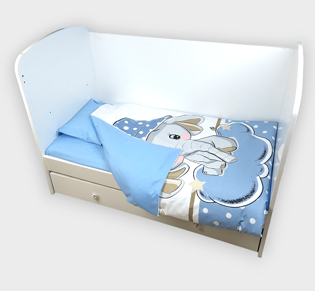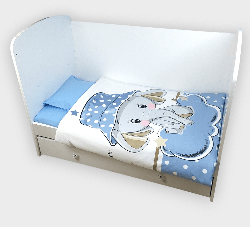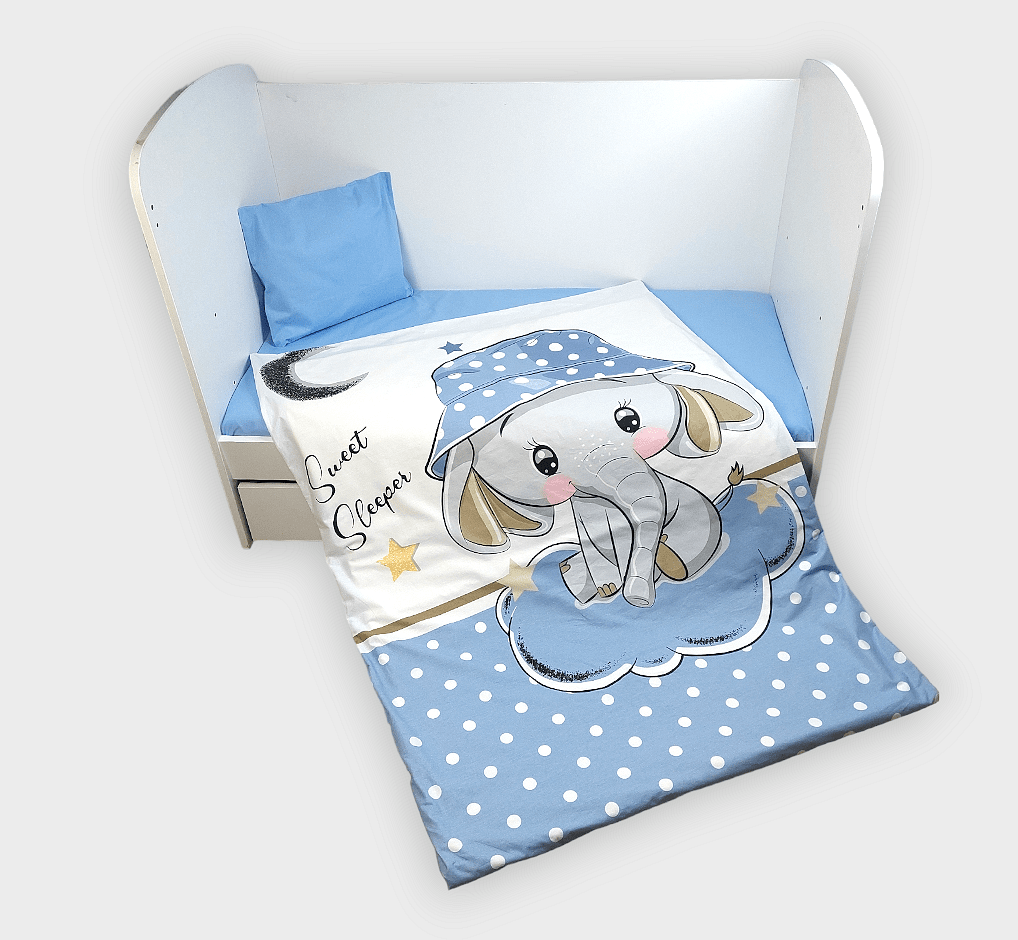 Бебешки спален комплект Синьо слонче е изработен от висококачествени материали в свежи цветове, които да внасят уют в детската стая. Дизайнът е стилен и оригинален. Комплекта ще пренесе малкото Ви съкровище в света на приказните сънища с лекота.