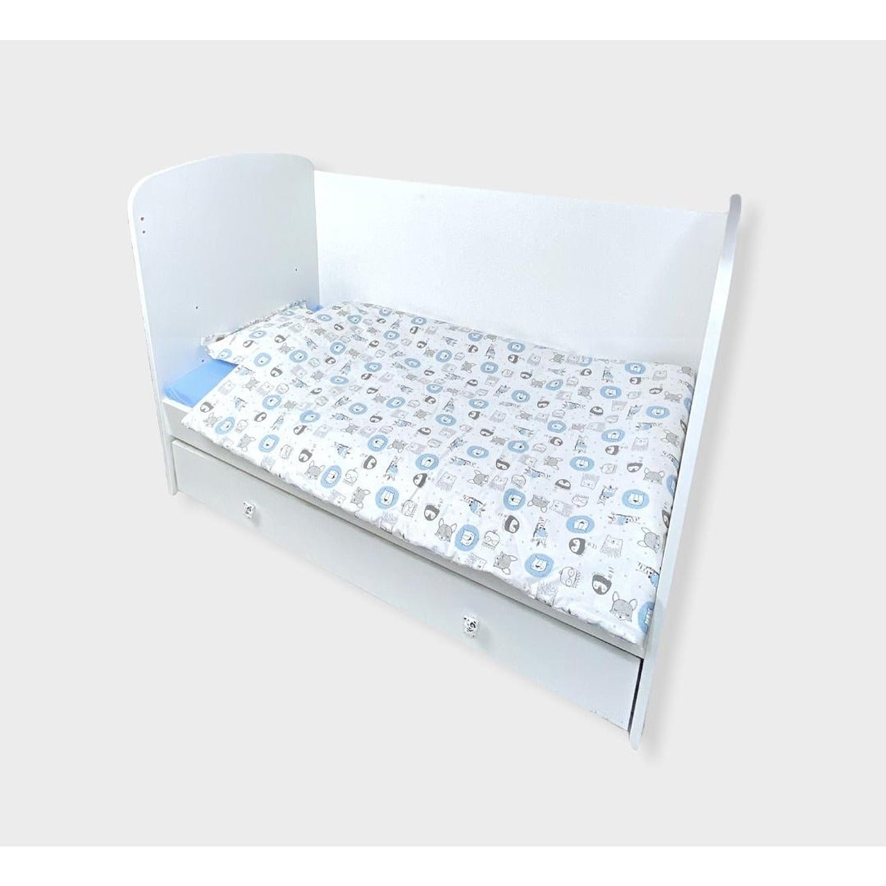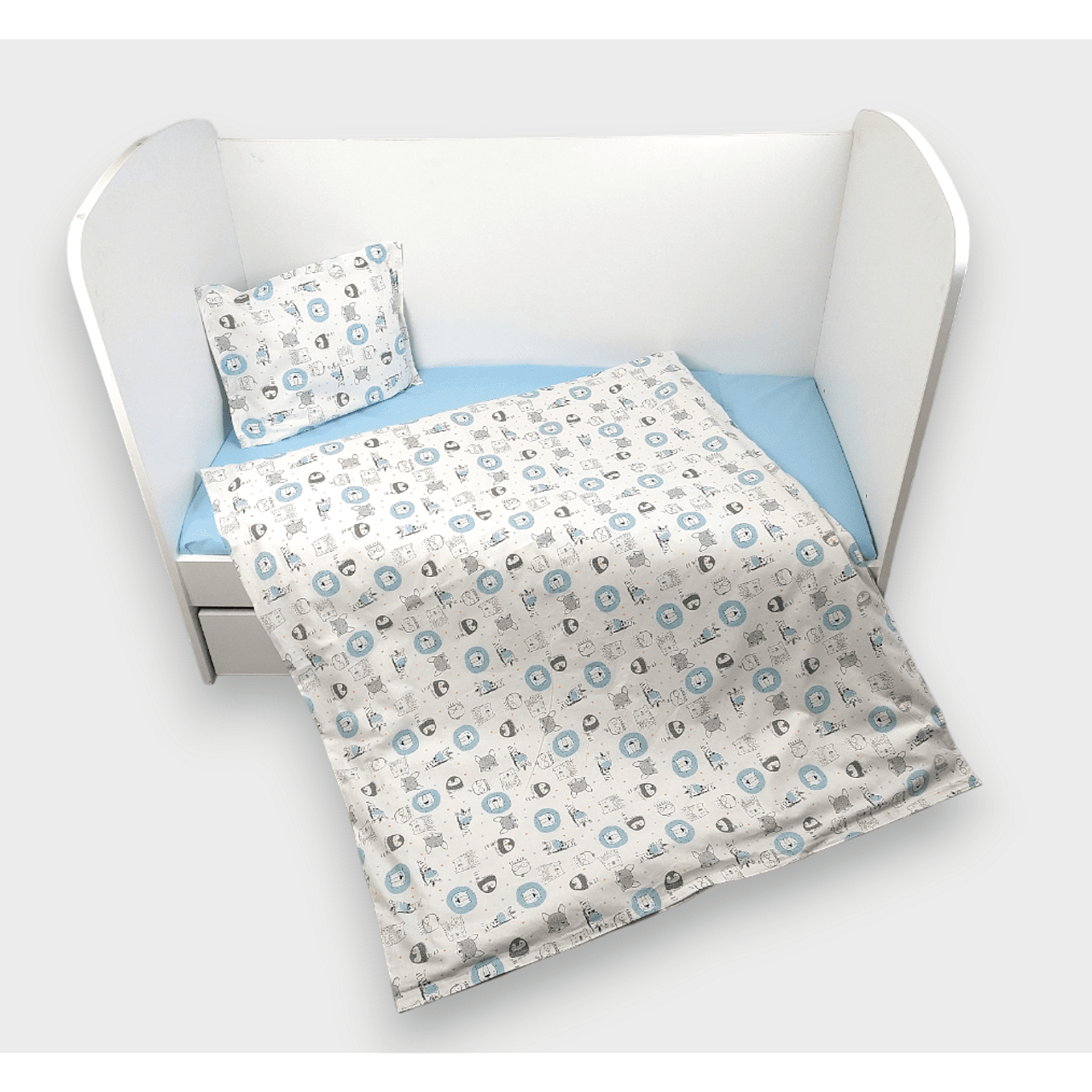 Бебешки спален комплект Сини животинки е изработен от висококачествени материали в свежи цветове, които да внасят уют в детската стая. Дизайнът е стилен и оригинален. Комплекта ще пренесе малкото Ви съкровище в света на приказните сънища с лекота.