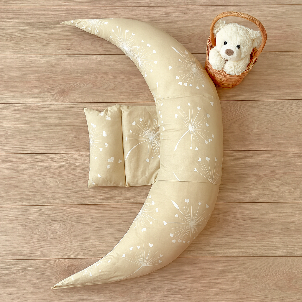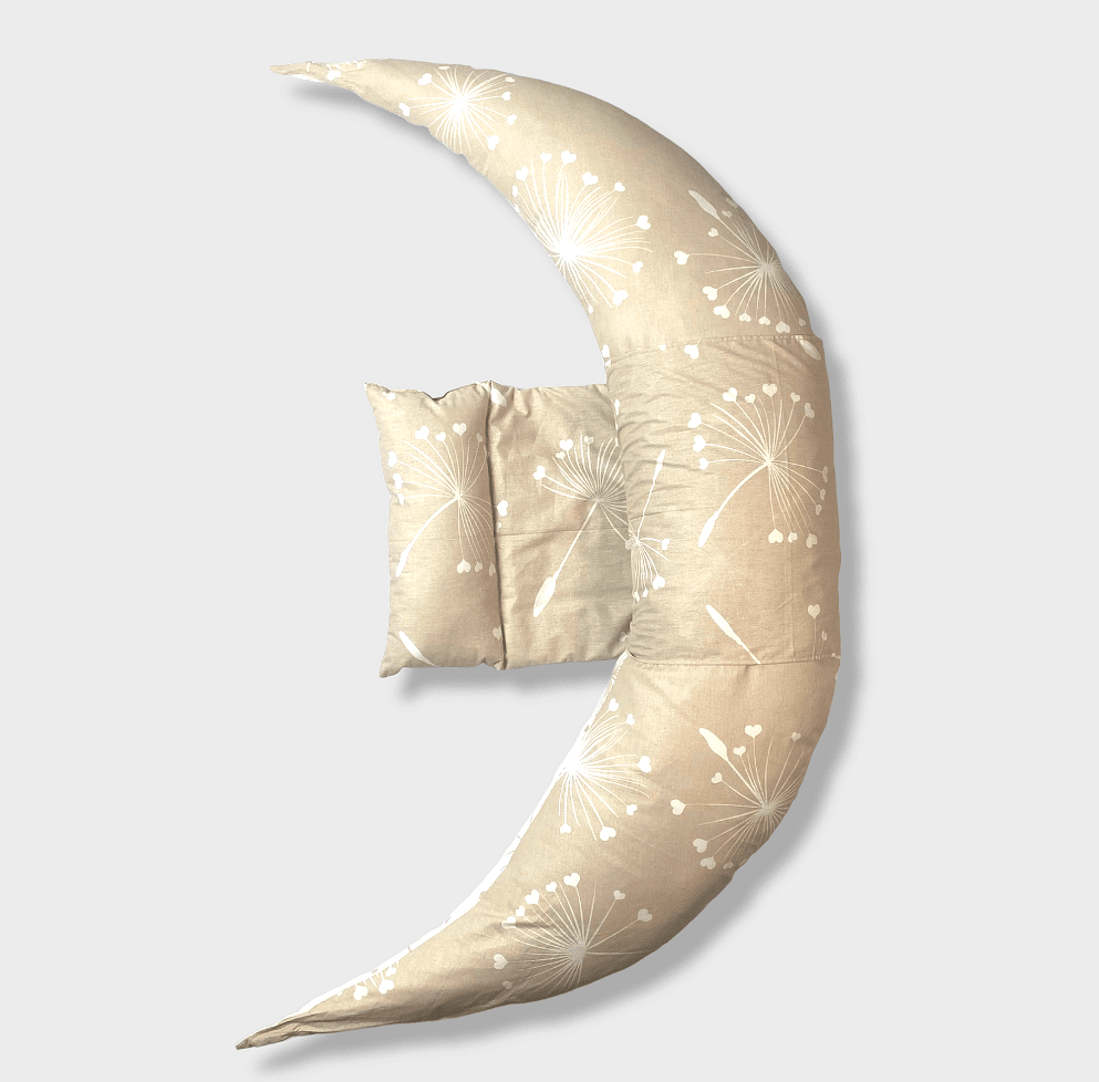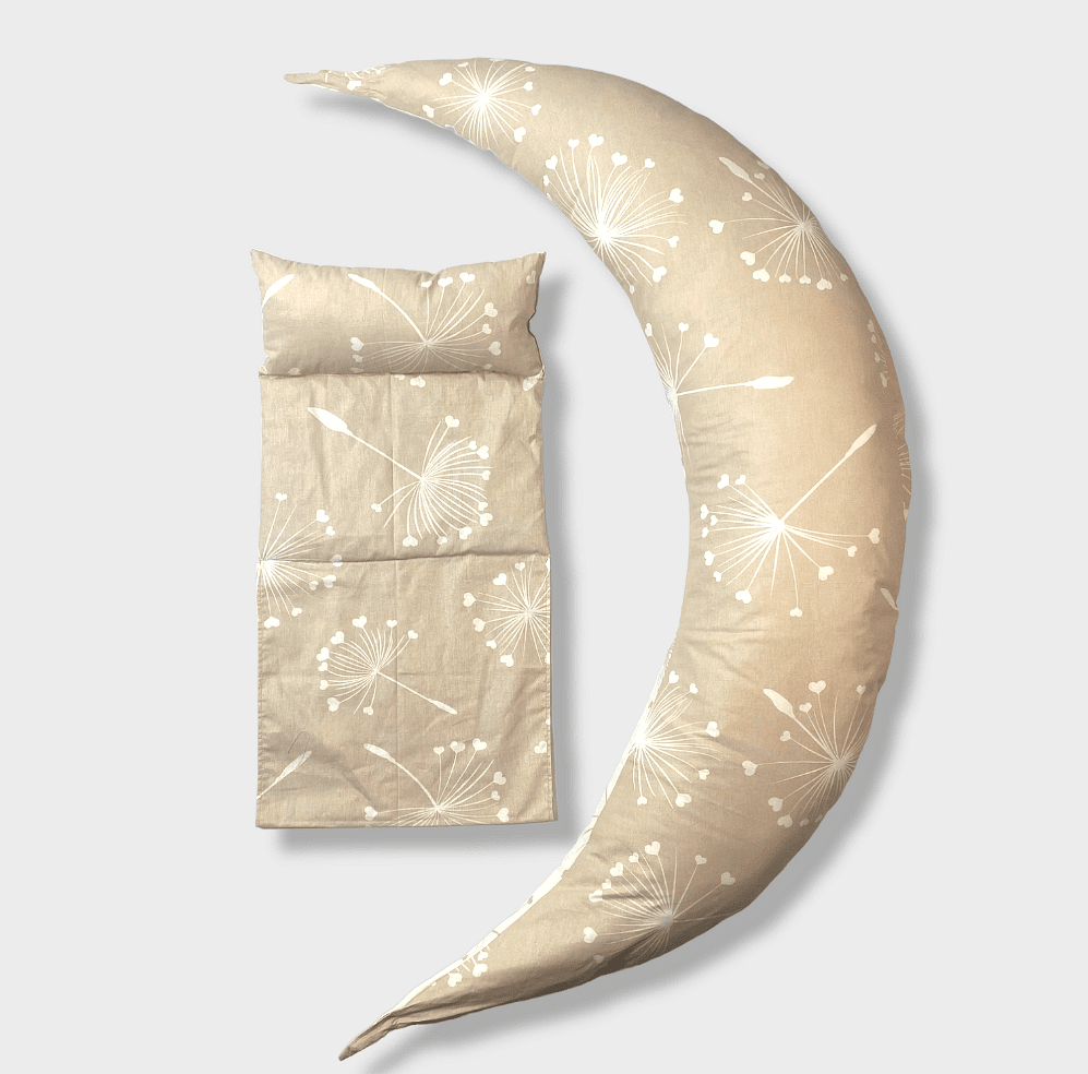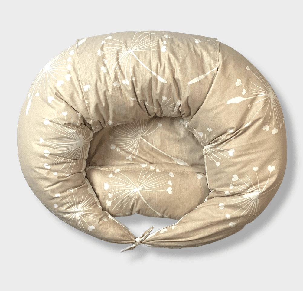 Мултифункционална възглавница за кърмене 10в1 със силиконов пълнеж и сваляем калъф от ранфорс Бежови глухарчета със сваляема възглавничка. Благодарение на уникалната система за възстановяване и подкрепа, възглавницата е едновременно универсален и уникален помощник за всяка бъдеща майка. Мултифункционалната възглавницата 10в1 изключително много помага на майките по време на бременността, тъй като спомага да се запази тялото в оптимална позиция, която да осигури по-добро кръвоснабдяване на плода и дава на майката дълъг и спокоен сън. След раждането може да се използва като опорна възглавница по време на кърмене, в последствие като порасне бебето - и като меко легълце за игра.