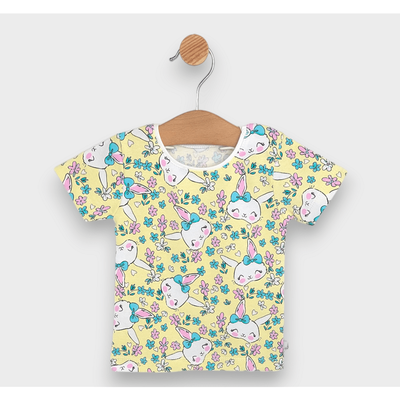 Бебешка блуза с къс ръкав Зайче с панделка е със свободна и удобна кройка. Изработена от мека и лека метирия.
