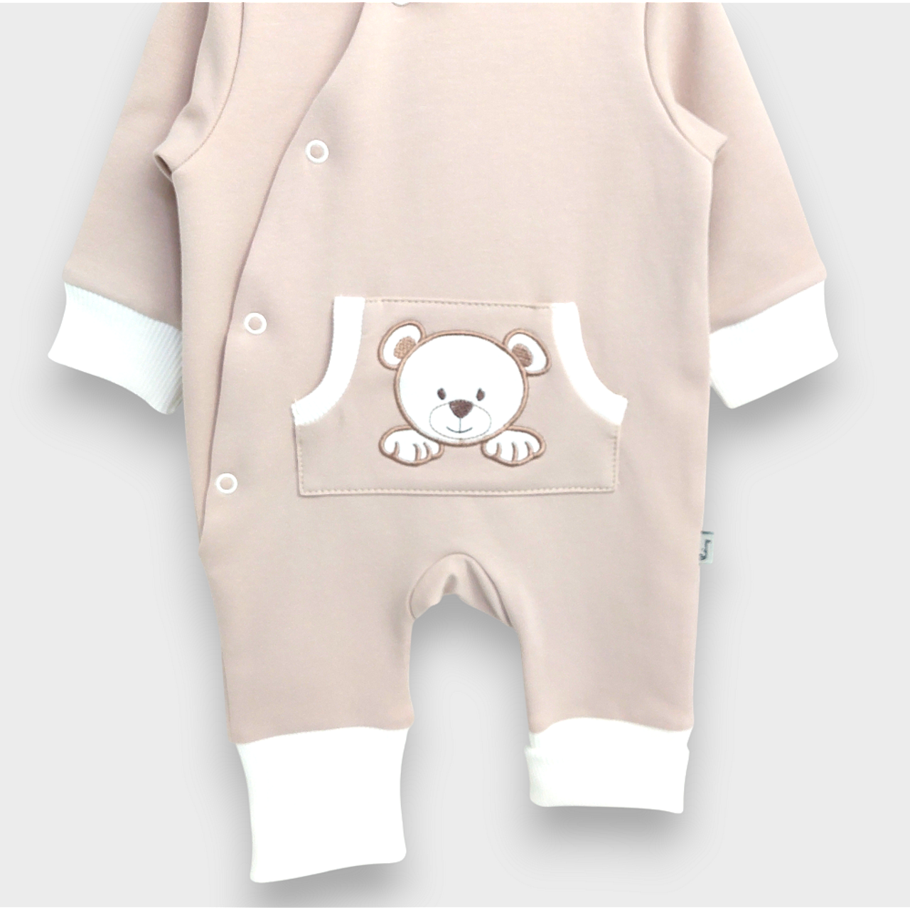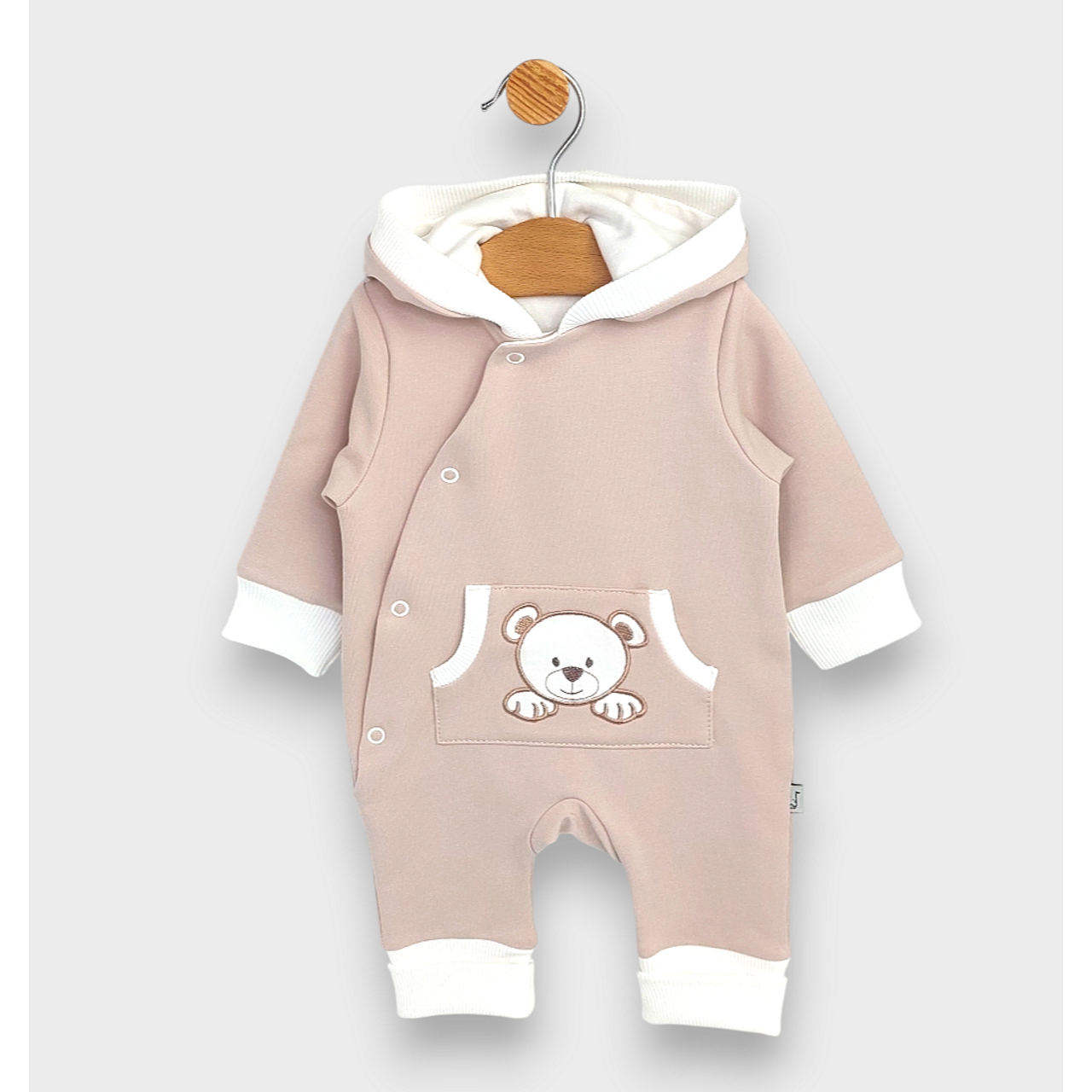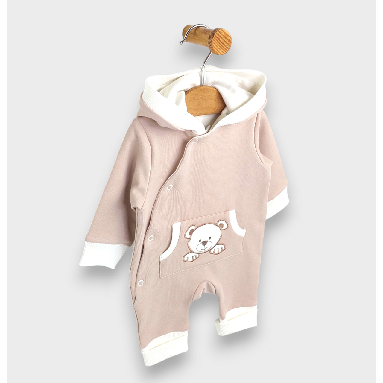 Този очарователен гащеризон е създаден с мисъл за комфорта и топлината на най-малките. Със своята мека материя и практична качулка, той ще пази вашето дете топло и сухо, докато изследва света около себе си. Дизайнът с мече и лапички добавя игрив елемент, който със сигурност ще се хареса на малчуганите.