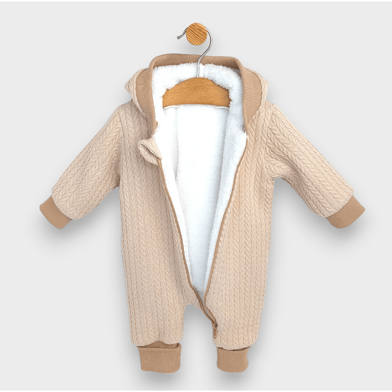 Този очарователен гащеризон е изработен от висококачествени плетива, които гарантират топлина и комфорт дори в студените дни. С удобния цип по цялата дължина, обличането и събличането става бързо и лесно, а качулката добавя допълнителна защита за главичката на вашето бебе. Със своята нежна бежова цветова гама, този гащеризон е идеален за малкиките и се предлага в размери от 56 до 80 см.