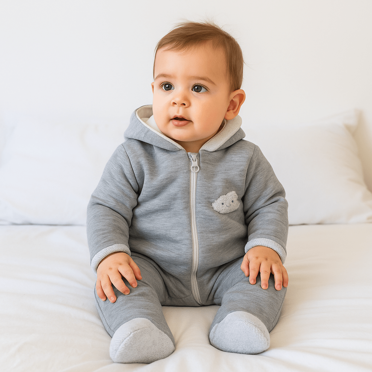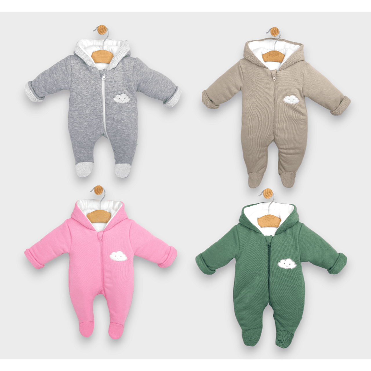 Бебешки ватиран зимен гащеризон за новородено тип космонавт с дълъг ръкав, предно закопчаване с цип и качулка с бродерия Облаче.