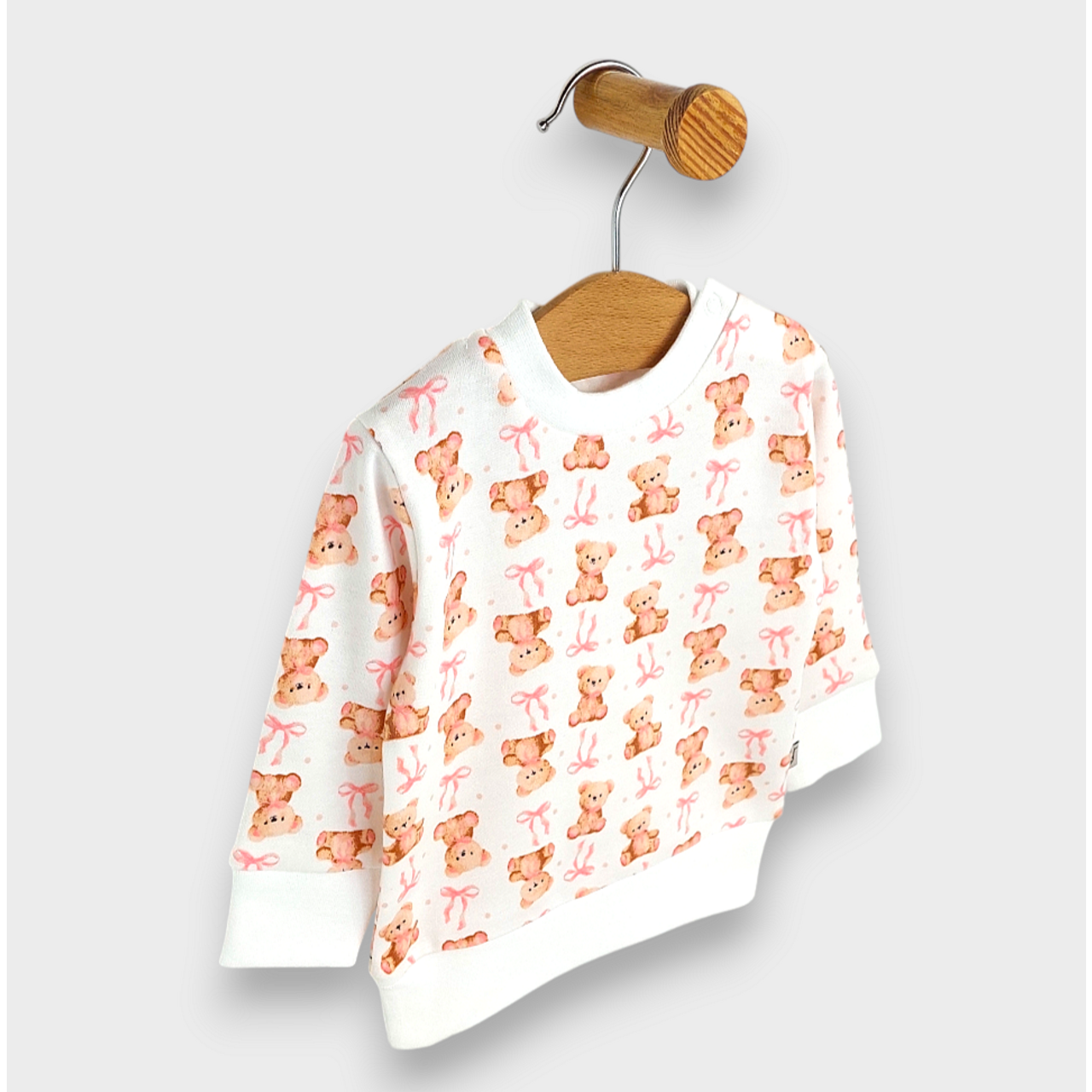 Комплектът се състои от: Блуза с дълъг ръкав и удобни панталони с ластик, които гарантират свобода на движение и лесно обличане. Материята е специално подбрана, 100% памук за блузата и панталона, осигуряваща мекота и нежност към чувствителната бебешка кожа.