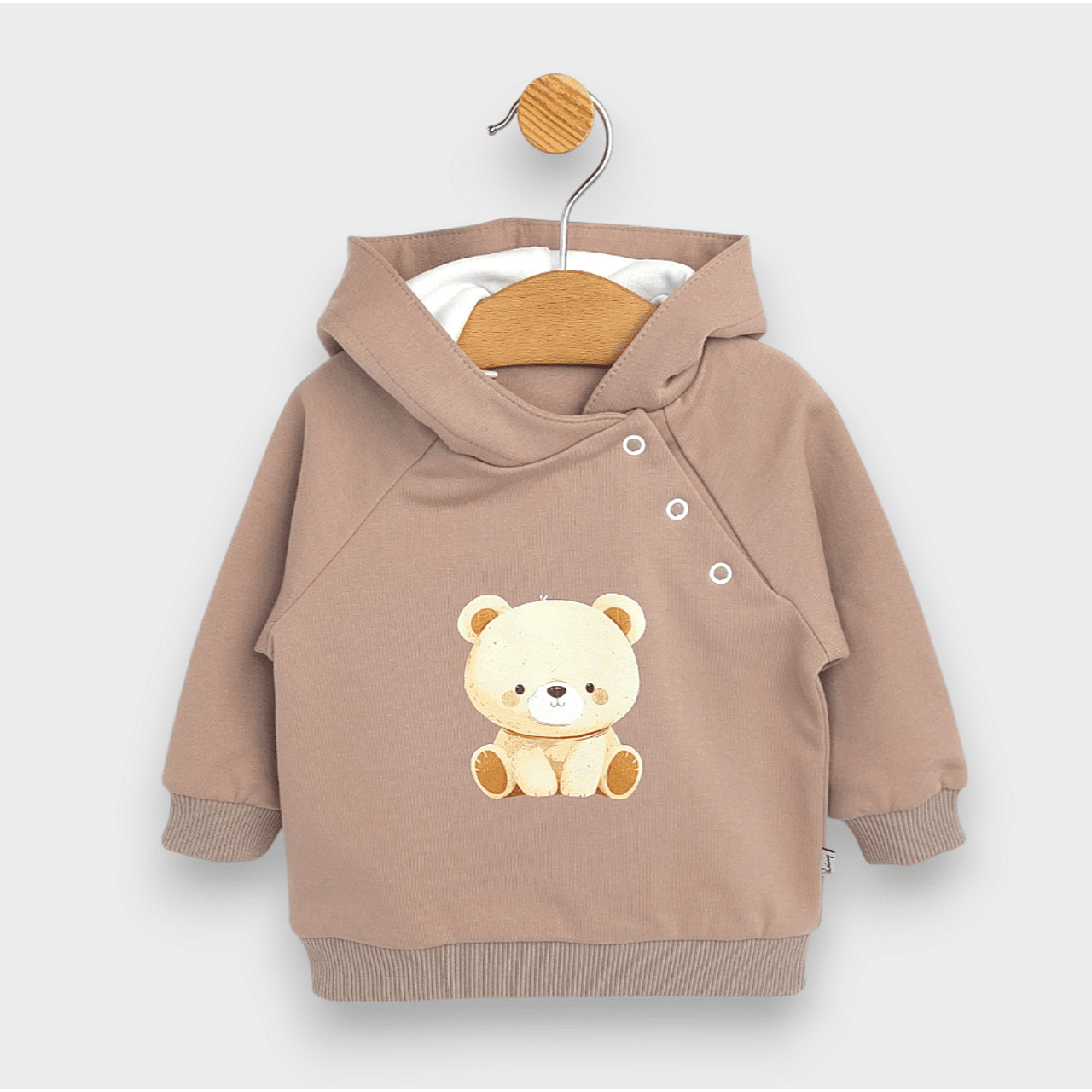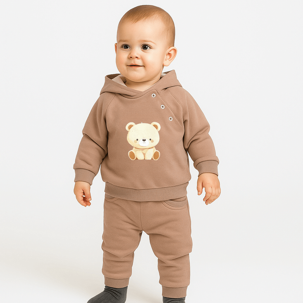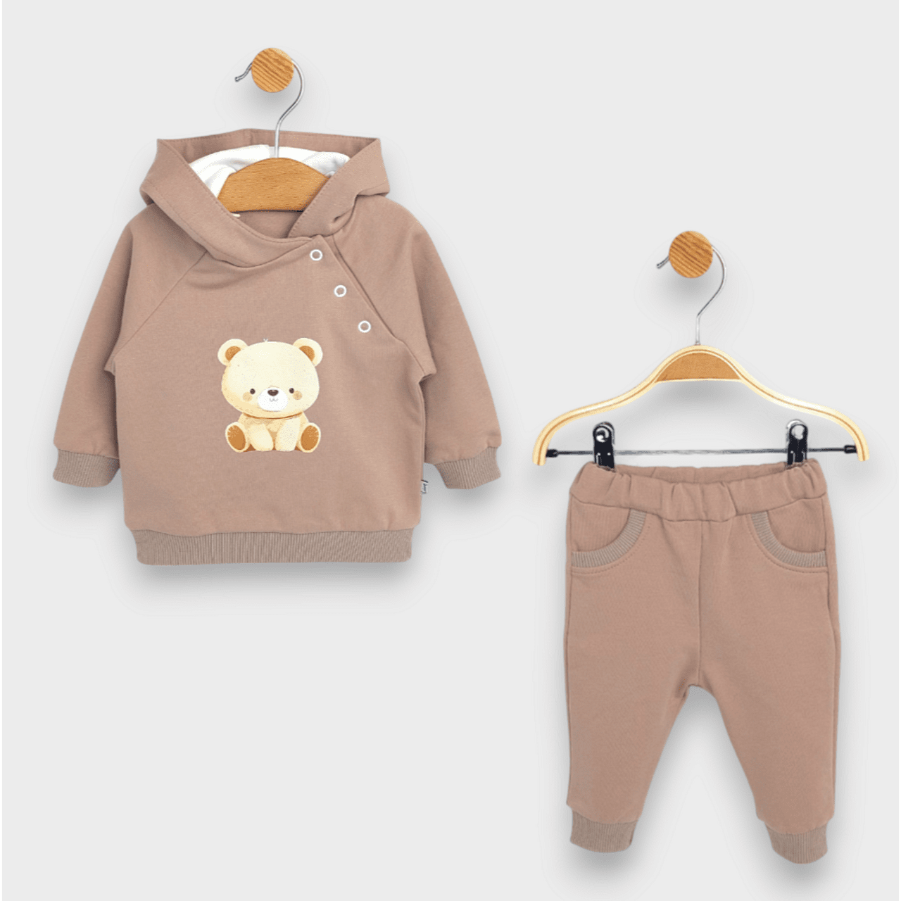 Изработен от висококачествени материали, този комплект е идеалният избор за вашето бебе от 62 до 92 см. Включващ меко худи с дълъг ръкав и удобни панталони, той осигурява пълна свобода на движение и комфорт през целия ден. Цветът допринася за елегантен и уютен външен вид.