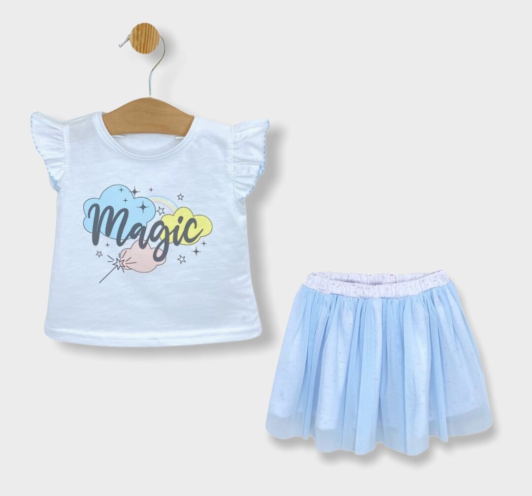Бебешки комплект от две части Magic за момиче от нежна и мека материя в пастелни цветове. Дизайн с весела и закачлива картинка. Комплекта включва блузка с къс ръкав с нежни харбали и къса пала с нежен тюл и подплата в цветен дизайн. Бебешкия комплект се предлага от 2 до 18 месечна възраст. Произведено от българския бранд Rainy.