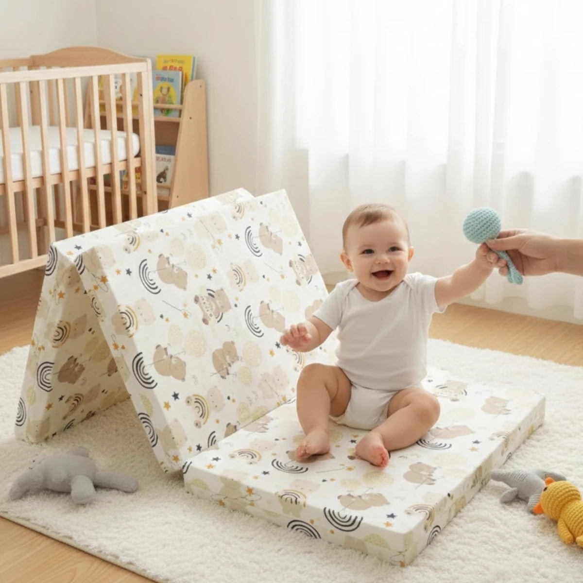 Този матрак е не просто удобен за сън, но и изключително практичен за пътуване. Сгъваемата му структура позволява лесно пренасяне и съхранение, като същевременно предоставя мек и безопасен повърхност за игра и почивка на Вашето мъниче. Дизайнът добавя допълнително очарование и стил в детската стая.