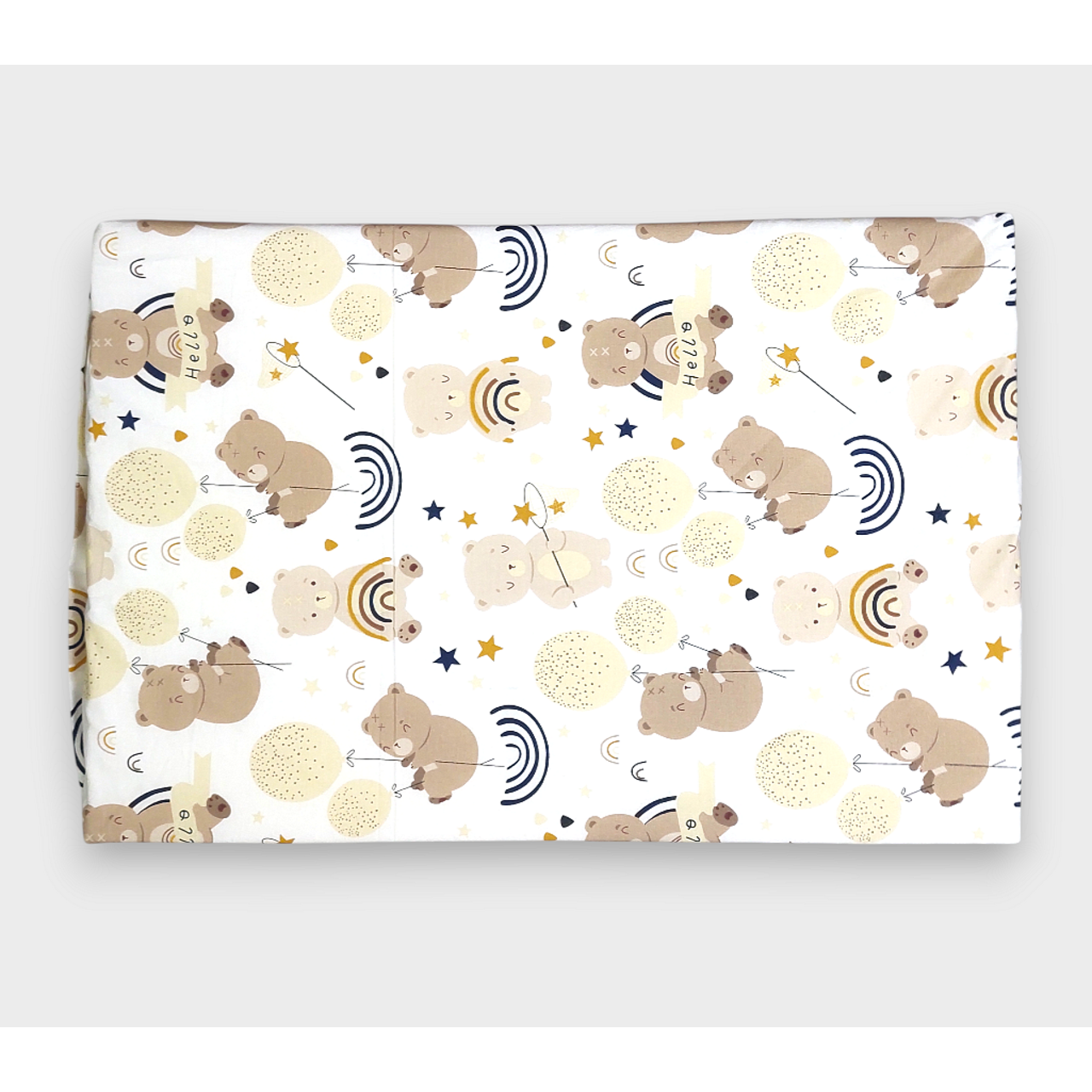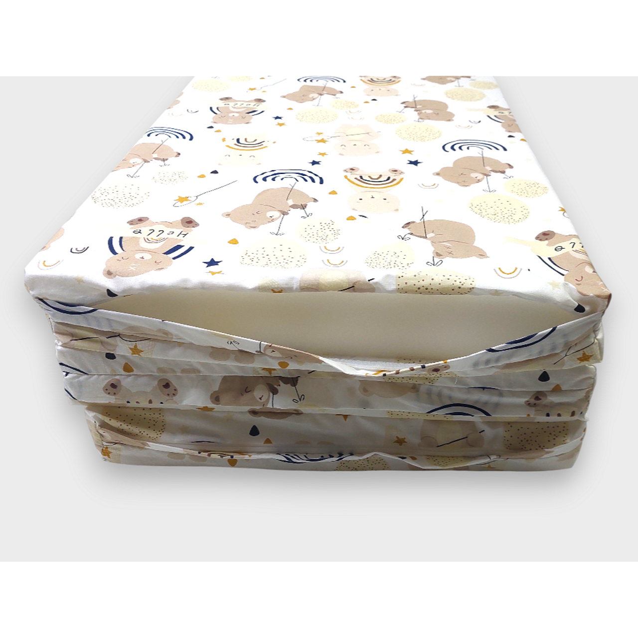 Бебешки сгъваем матрак Мече с балони е хипоалергичен и е изработен от 100% памучен ранфорс. Той има плътен пълнеж от мека пяна, за да може да се адаптира към тялото на бебето. Сгъваемият му дизайн позволява да го взимате с вас по време на пътуване. Калъфа го прави лесен за поддръжка, тъй като може да е сваля с удобен цип.