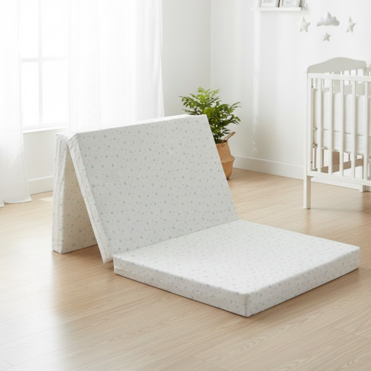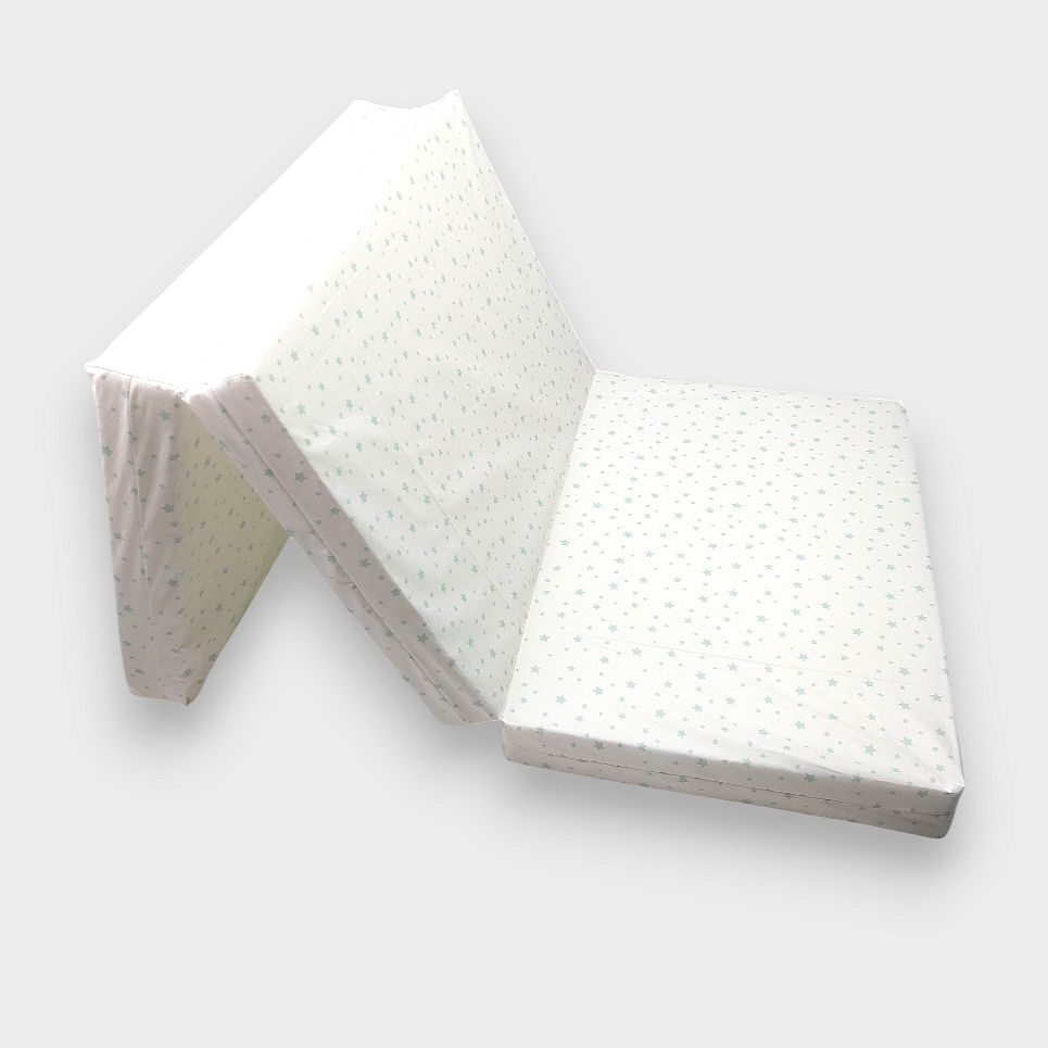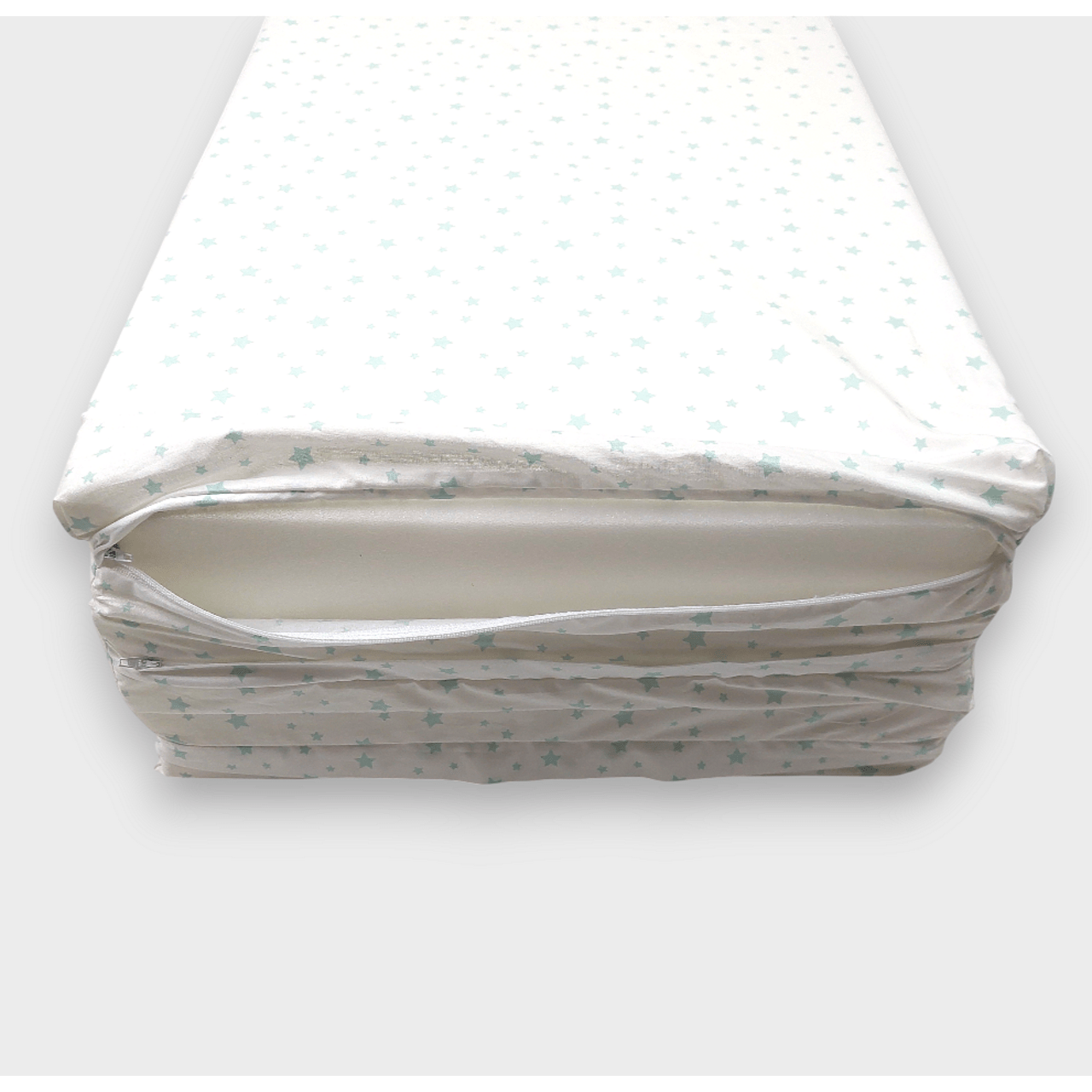 Бебешки сгъваем матрак Мента звезди е хипоалергичен и е изработен от 100% памучен ранфорс. Той има плътен пълнеж от мека пяна, за да може да се адаптира към тялото на бебетоСгъваемият му дизайн позволява да го взимате с вас по време на пътуване. Калъфа го прави лесен за поддръжка, тъй като може да е сваля с удобен цип.