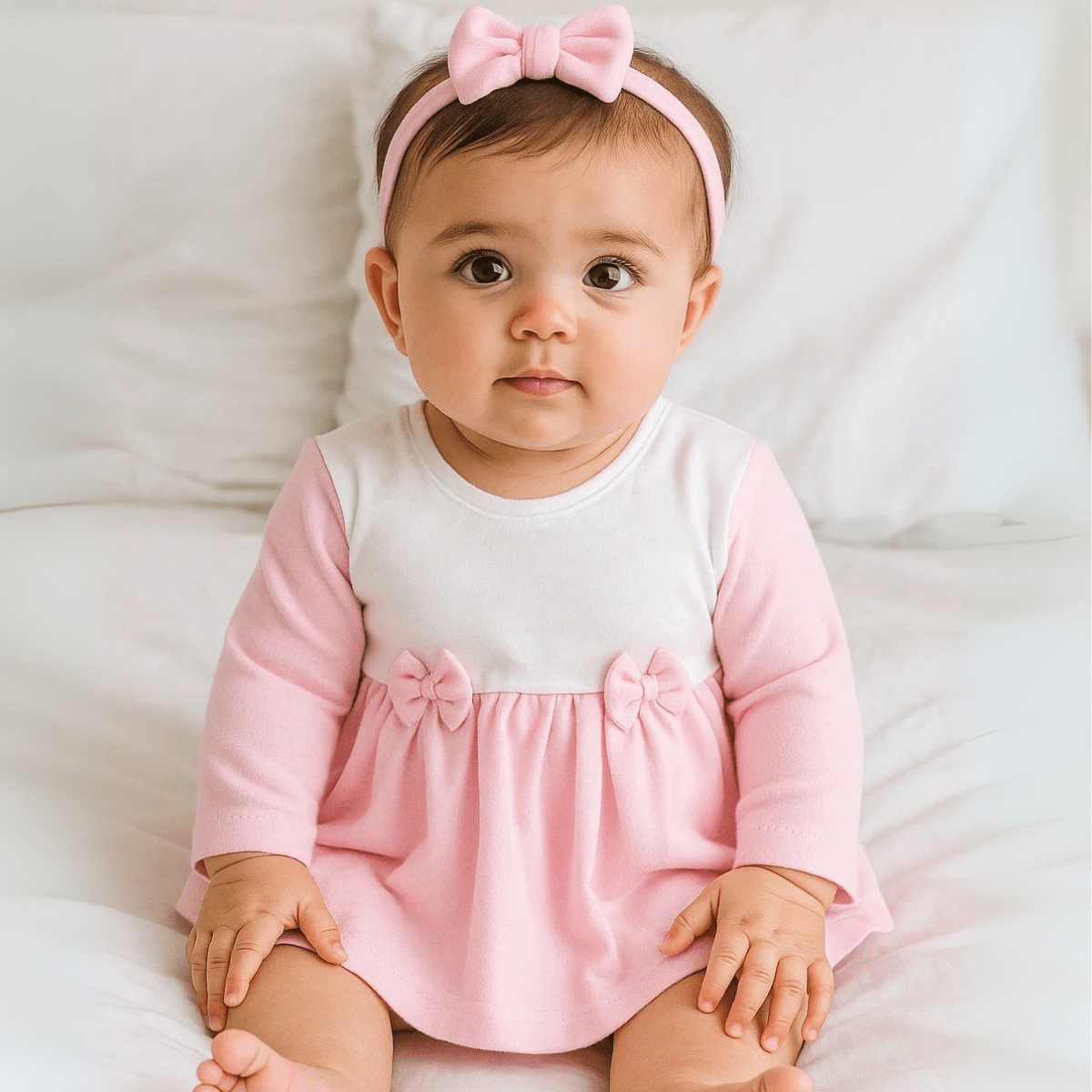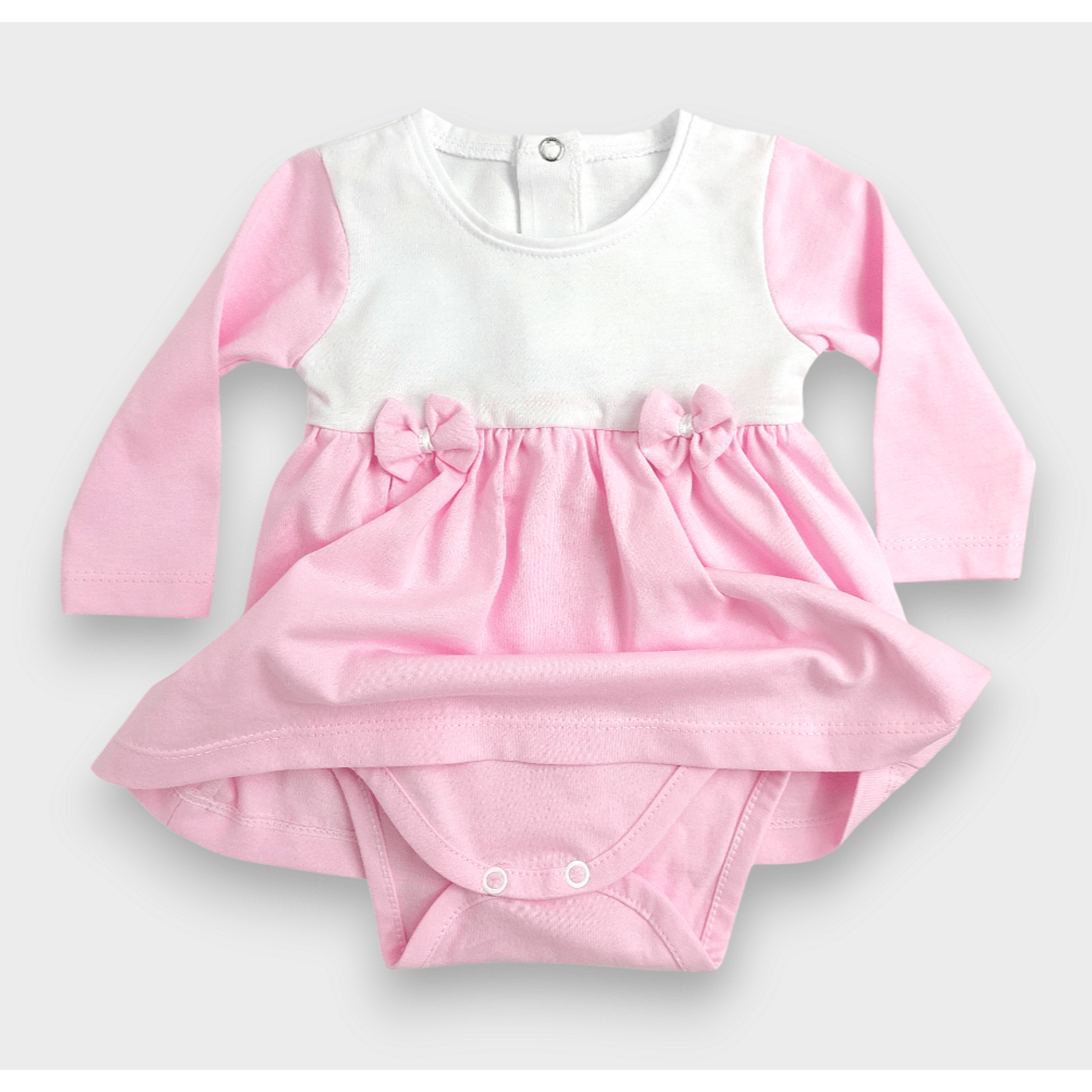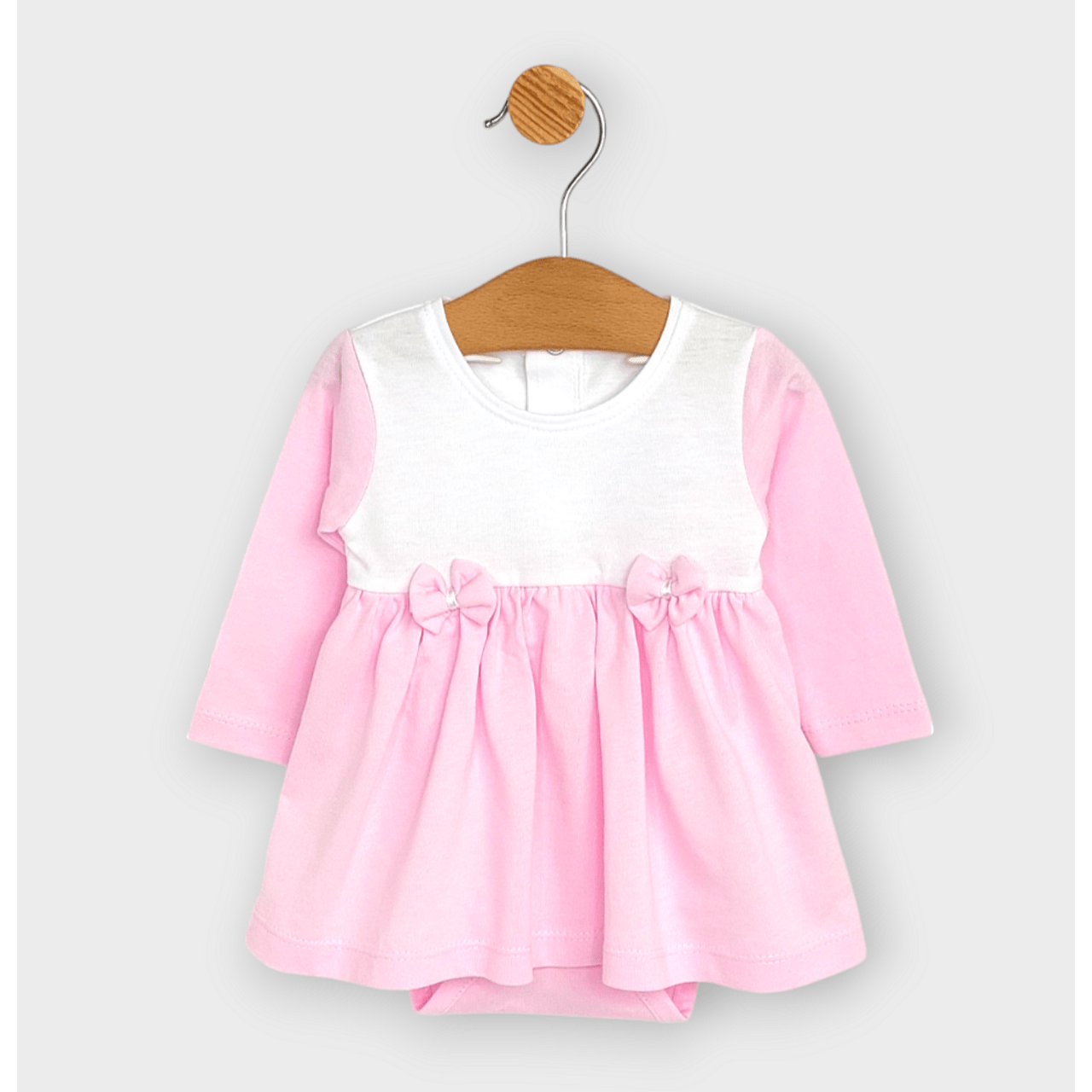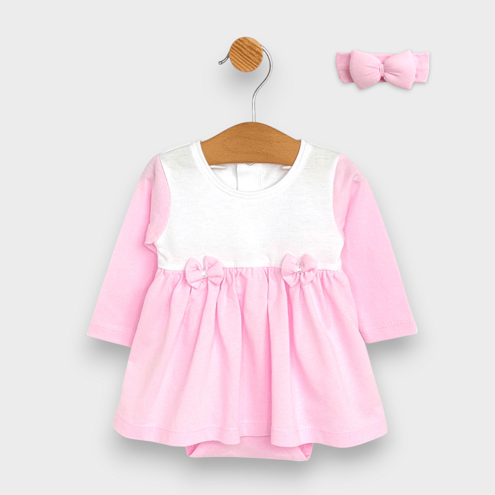 Разкошна бебешка боди - рокля с лента за глава за момиче от 0 до 12 месеца в нежни цветове. Горната част на роклята е с дълъги ръкави. Полата е разкроена. Бодито е пришито към роклята, като се закопчава отдолу, за лесна смяна на пелените. Елегантна и практична бебешка боди-рокля, подходяща както за ежедневието, така и за специален повод.