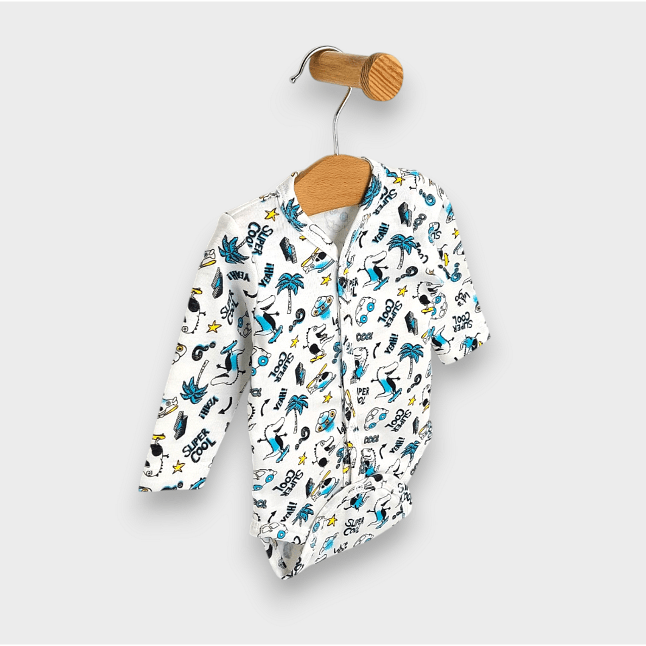 Създадено от мека и дишаща материя, бодито е нежно към чувствителната бебешка кожа, като предотвратява раздразнения и алергии. Предното закопчаване улеснява обличането и събличането, което е особено ценно по време на промените на пелените. Размерите варират от 48 до 62 см, което гарантира, че ще намерите перфектния размер за вашето растящо бебе.