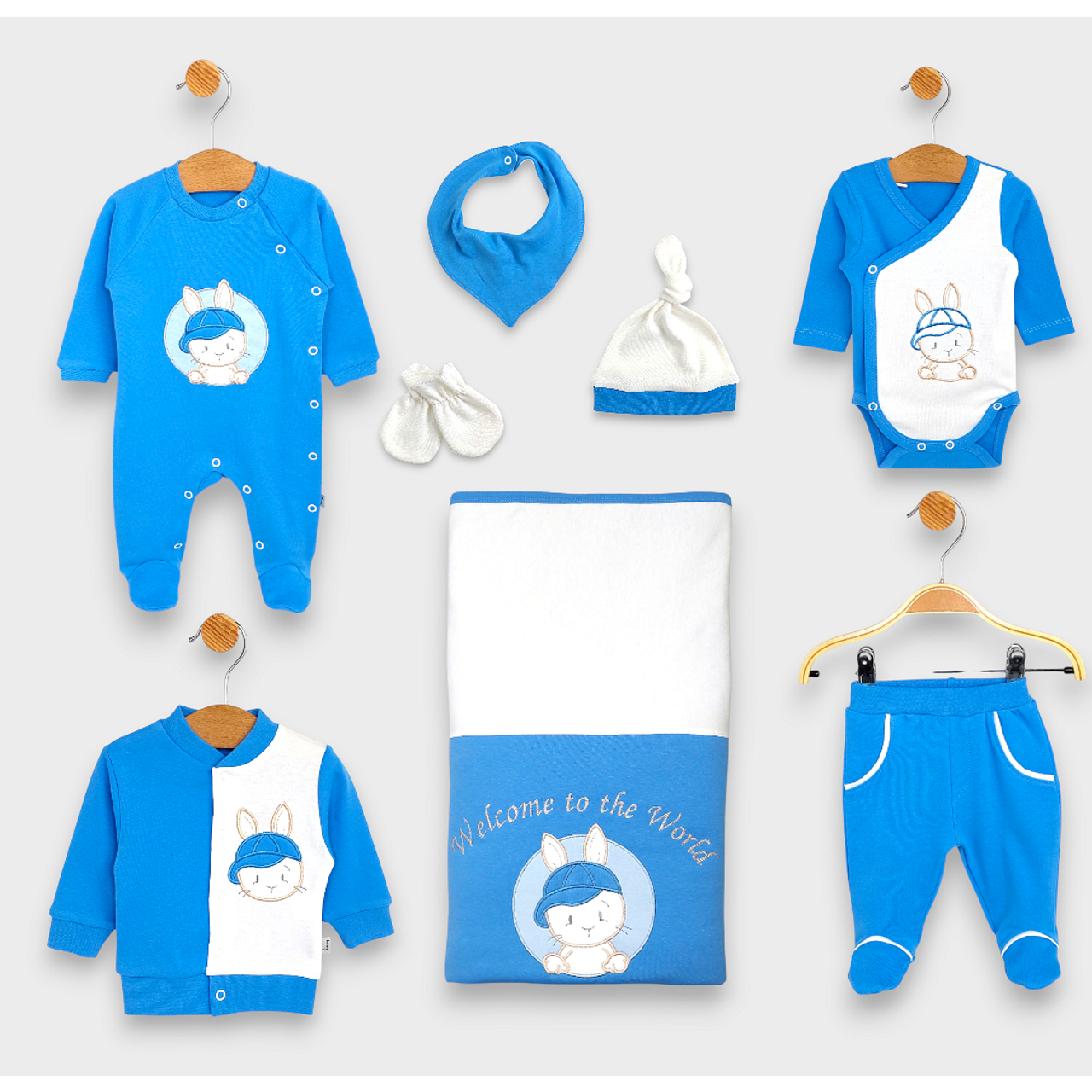 Бебешки комплект за изписване от осем части Bunny е идеален за деня, в който бебето се показва за пръв път пред света. Комплекта има всички необходими неща. Изработен от мека материя, щадяща деликатната бебешка кожа. С весела и закачлива бродерия.