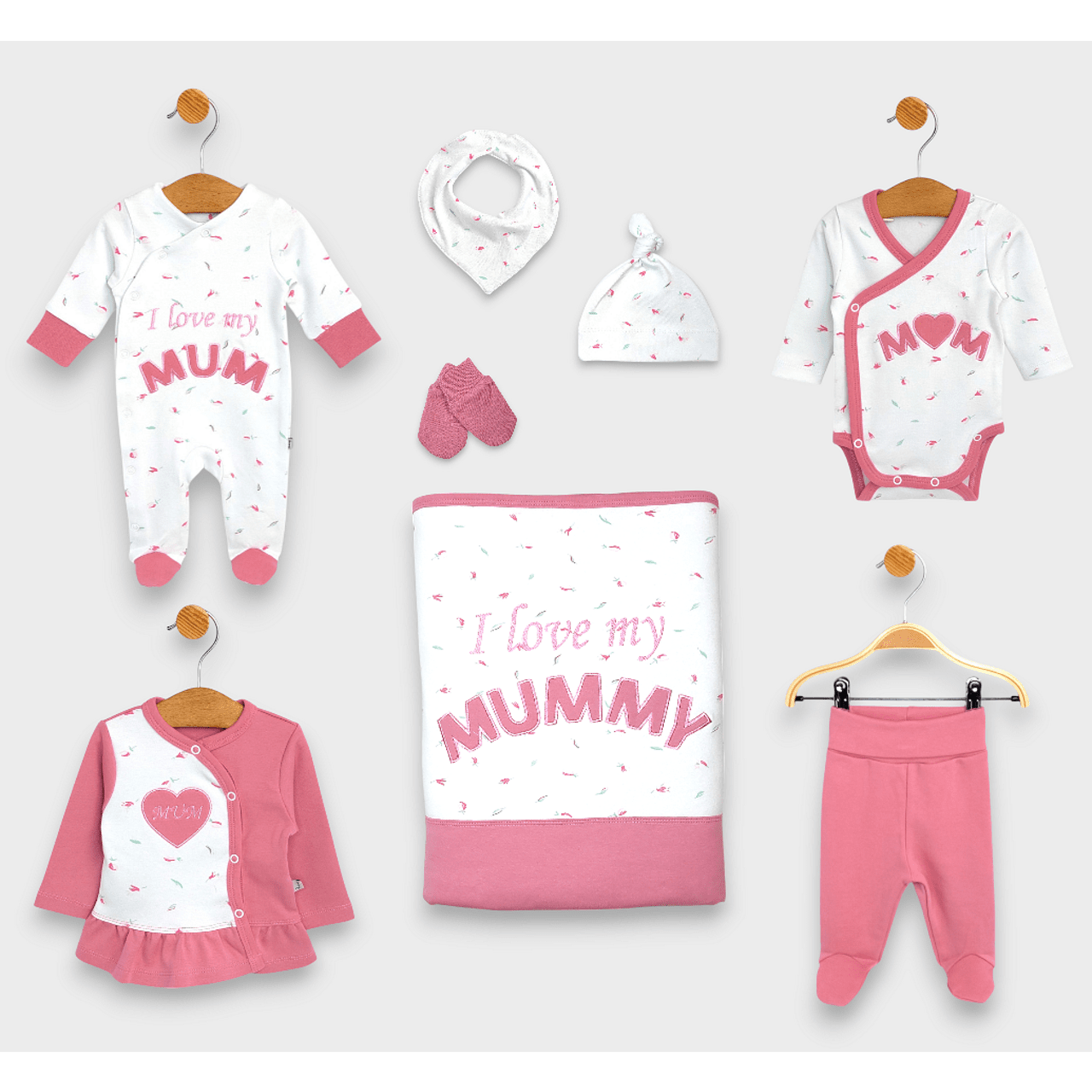 Започнете новото житейско пътешествие на Вашето мъниче със стил и нежност, избирайки "Rainy Бебешки комплект за изписване 8ч. I love my mummy".