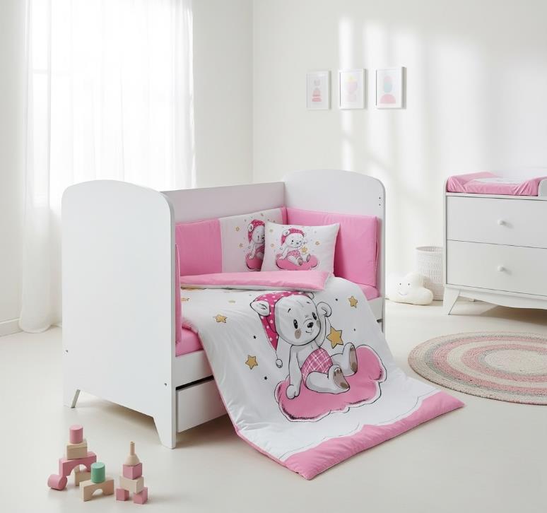 Луксозният бебешки обиколник Розово мече се поставя в бебешката кошара, за да предпази вашето дете докато спи или играе. Той е изработен от висококачествени материали в свежи цветове, които да внасят уют в детската стая. Дизайнът е стилен и оригинален. Обиколника ще пренесе малкото Ви съкровище в света на приказните сънища с лекота.