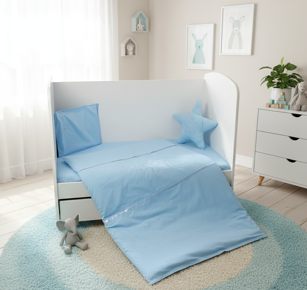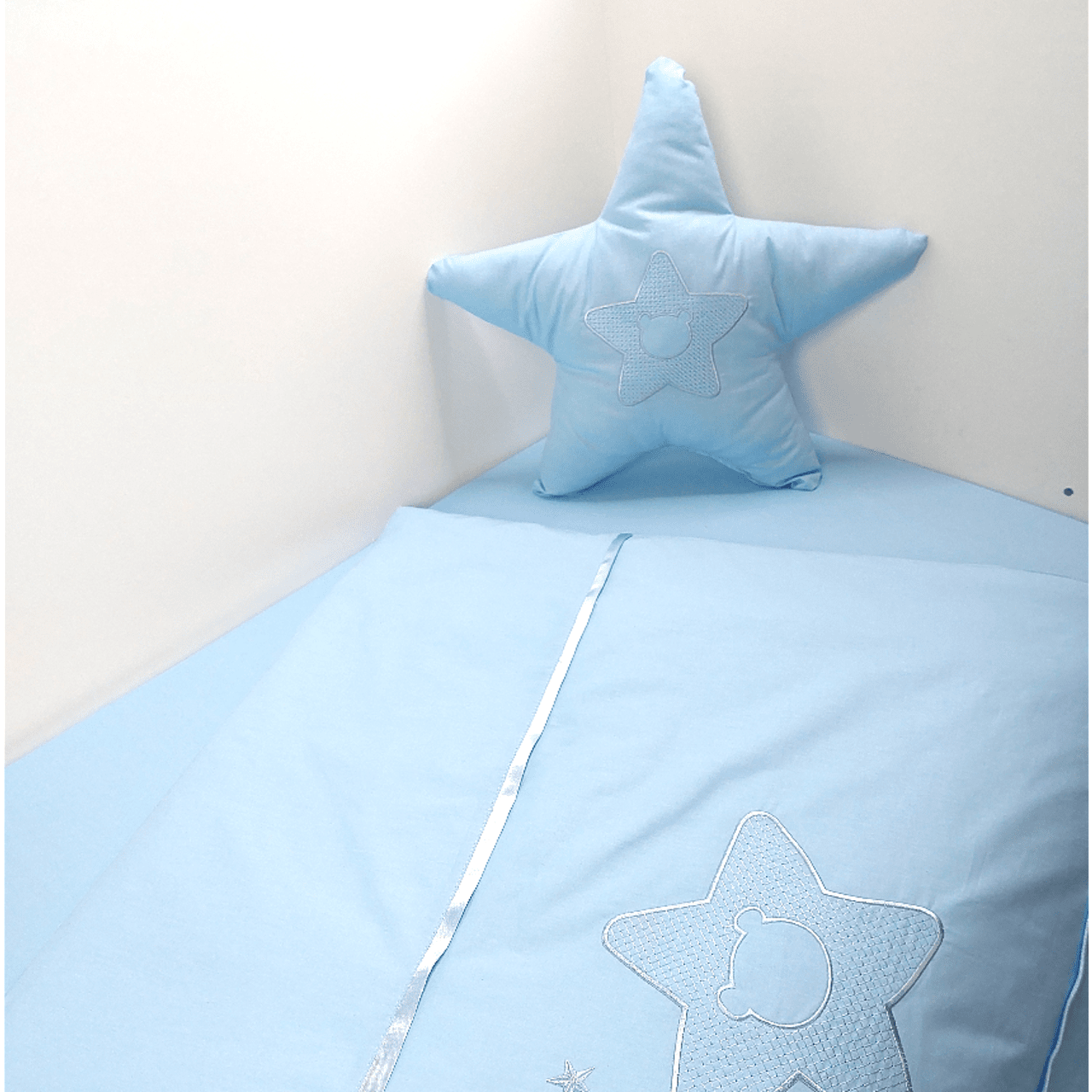 Бебешки спален комплект Звезда с мече е изработен от висококачествени материали в свежи цветове, които да внасят уют в детската стая. Дизайнът е стилен и оригинален със закачливи сатенени ленти. Комплекта ще пренесе малкото Ви съкровище в света на приказните сънища с лекота.