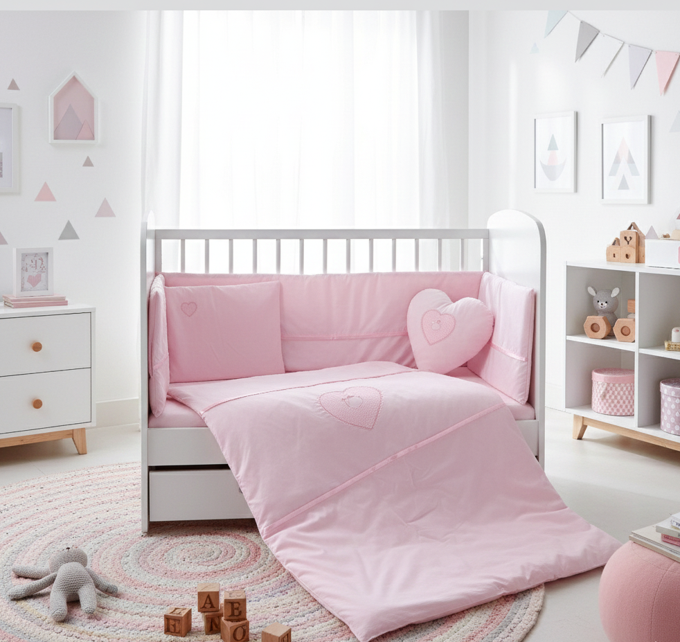 Бебешки спален комплект Сърце с мече е изработен от висококачествени материали в свежи цветове, които да внасят уют в детската стая. Дизайнът е стилен и оригинален. Комплекта ще пренесе малкото Ви съкровище в света на приказните сънища с лекота.