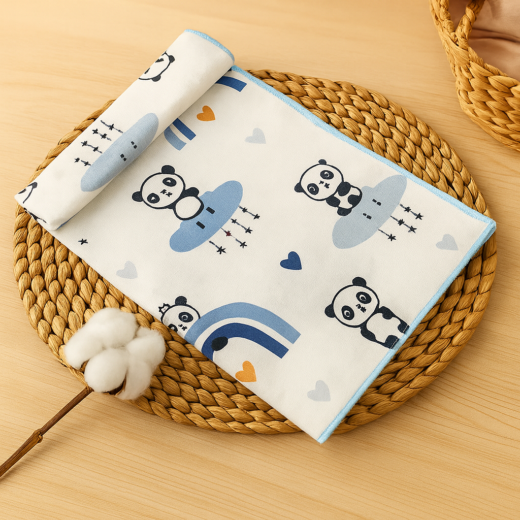 Бебешка памучна пелена от бархет Панда на синя дъга ще ви е необходима още от първите дни на бебето. Може да се слага на подложката за преповиване, като предпазна пелена между бебето и околния свят през първите месеци, като завивка през летните дни, по време на къпане, както и като защита върху коша за новородено или седалката на количката. Бебешката пелена е изработена от мека и деликатна памучна материя. Декорирана с нежен принт, от трайни и безопасни бои. Подходяща както за вкъщи, така и за разходка навън.