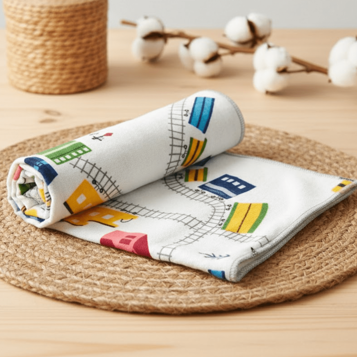Бебешка памучна пелена от бархет Шарено влакче ще ви е необходима още от първите дни на бебето. Може да се слага на подложката за преповиване, като предпазна пелена между бебето и околния свят през първите месеци, като завивка през летните дни, по време на къпане, както и като защита върху коша за новородено или седалката на количката. Бебешката пелена е изработена от мека и деликатна памучна материя. Декорирана с нежен принт, от трайни и безопасни бои. Подходяща както за вкъщи, така и за разходка навън.