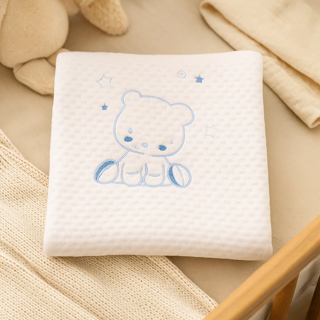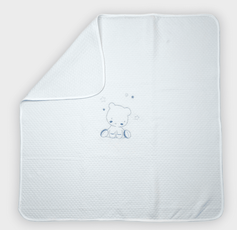 Бебешка пелена от капитонирано трико Синьо Мече ще ви е необходима още от първите дни на бебето. Може да се слага на подложката за преповиване, като предпазна пелена между бебето и околния свят през първите месеци, като завивка през летните дни, по време на къпане, както и като защита върху коша за новородено или седалката на количката. Бебешката пелена е изработена от мека и деликатна памучна материя. Декорирана с нежна бродерия в нежни цветове. Подходяща както за вкъщи, така и за разходка навън.