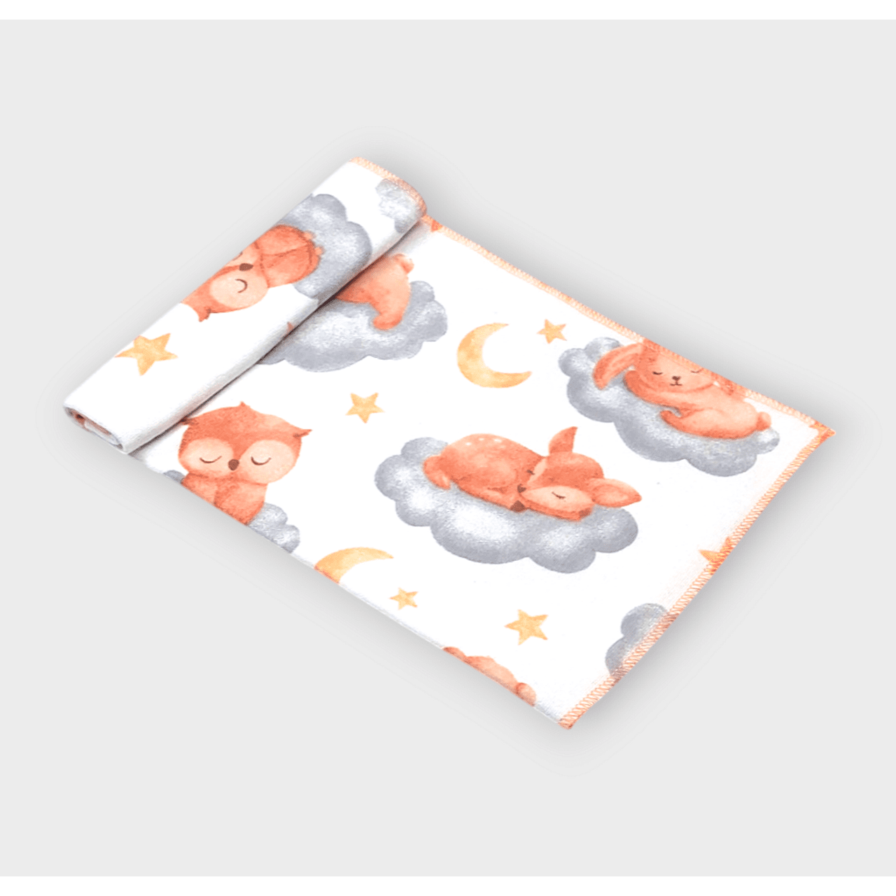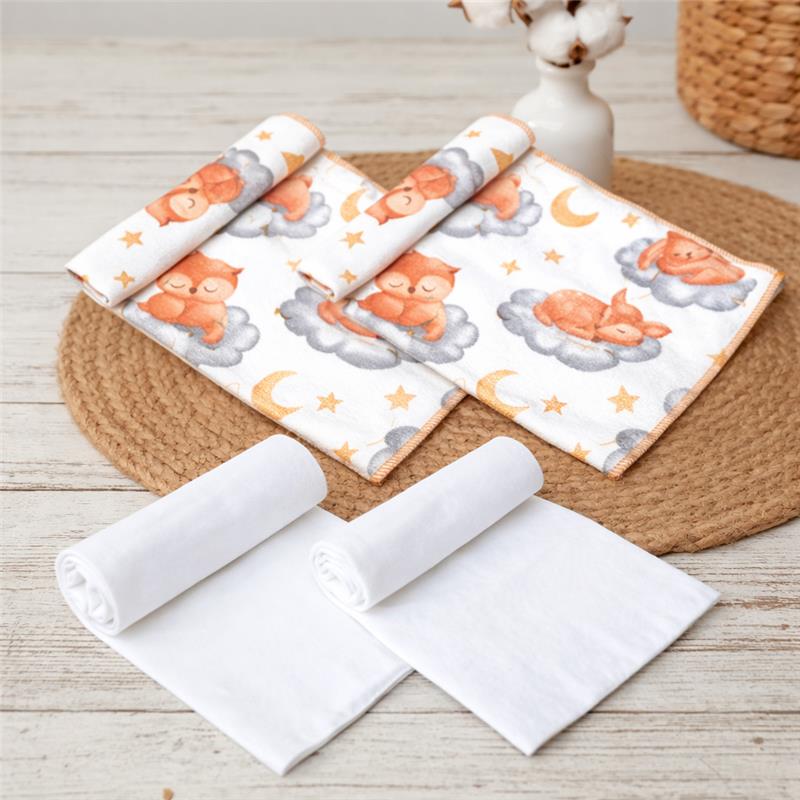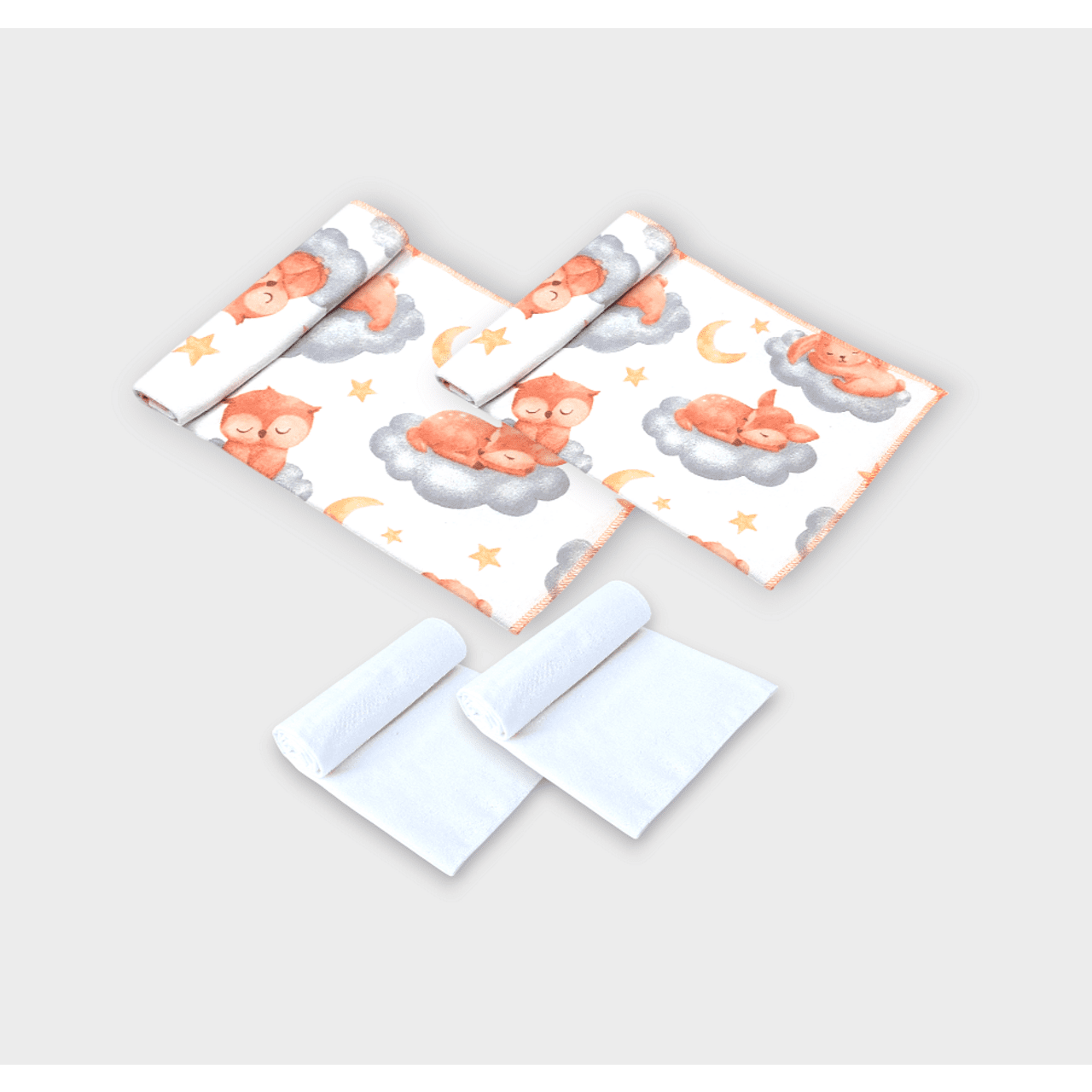 Комплект памучни пелени за бебе Бархет и Тензух 4 бр. Бухалче на облак ще ви са необходими още от първите дни на бебето. Може да се слагат на подложката за преповиване, като предпазна пелена между бебето и околния свят през първите месеци, като завивка през летните дни, по време на къпане, както и като защита върху коша за новородено или седалката на количката. Бебешките пелени са изработена от мека и деликатна памучна материя. Декорирана с нежен принт, от трайни и безопасни бои. Подходяща както за вкъщи, така и за разходка навън.