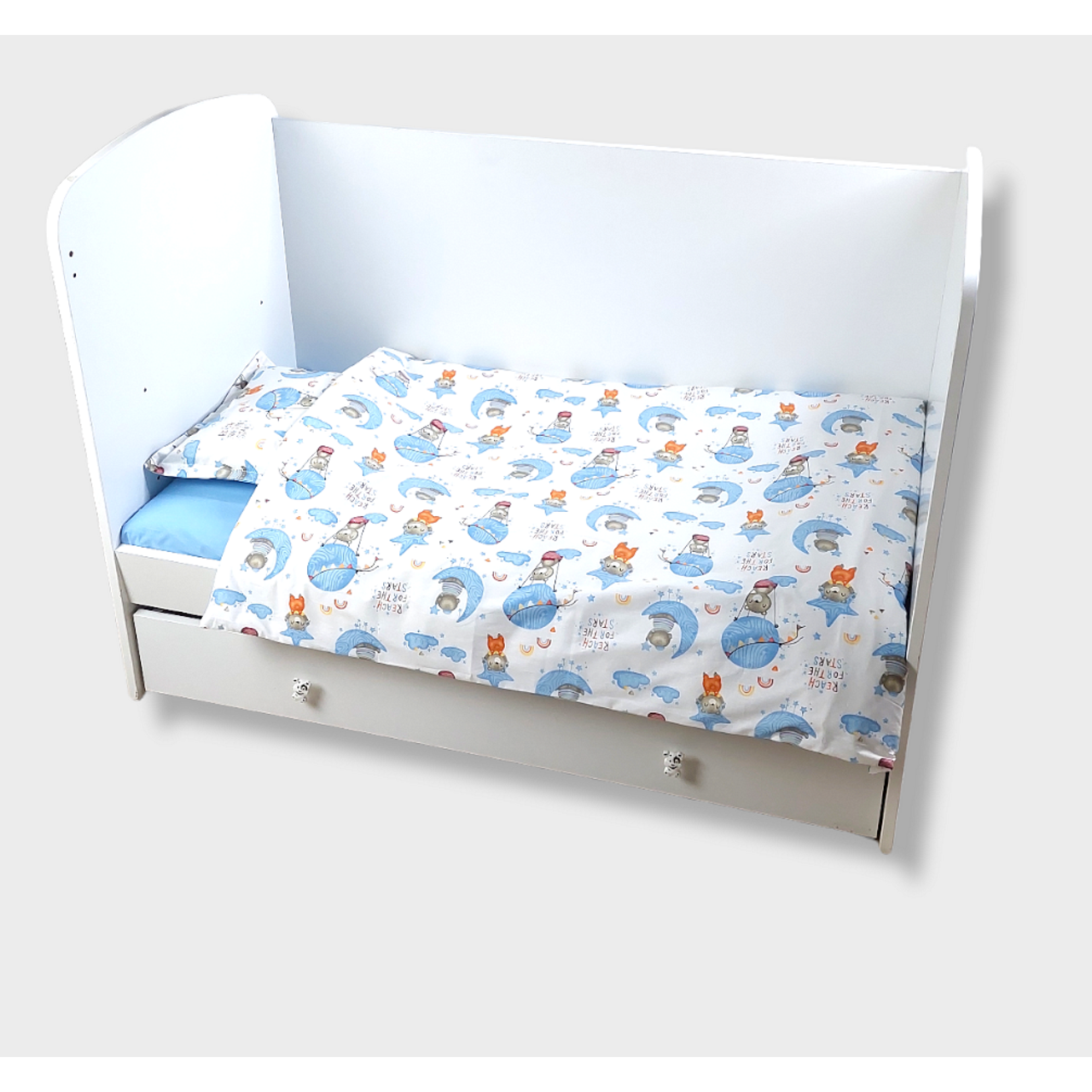 Бебешки спален комплект Мече на луна син е изработен от висококачествени материали в свежи цветове, които да внасят уют в детската стая. Дизайнът е стилен и оригинален. Комплекта ще пренесе малкото Ви съкровище в света на приказните сънища с лекота.