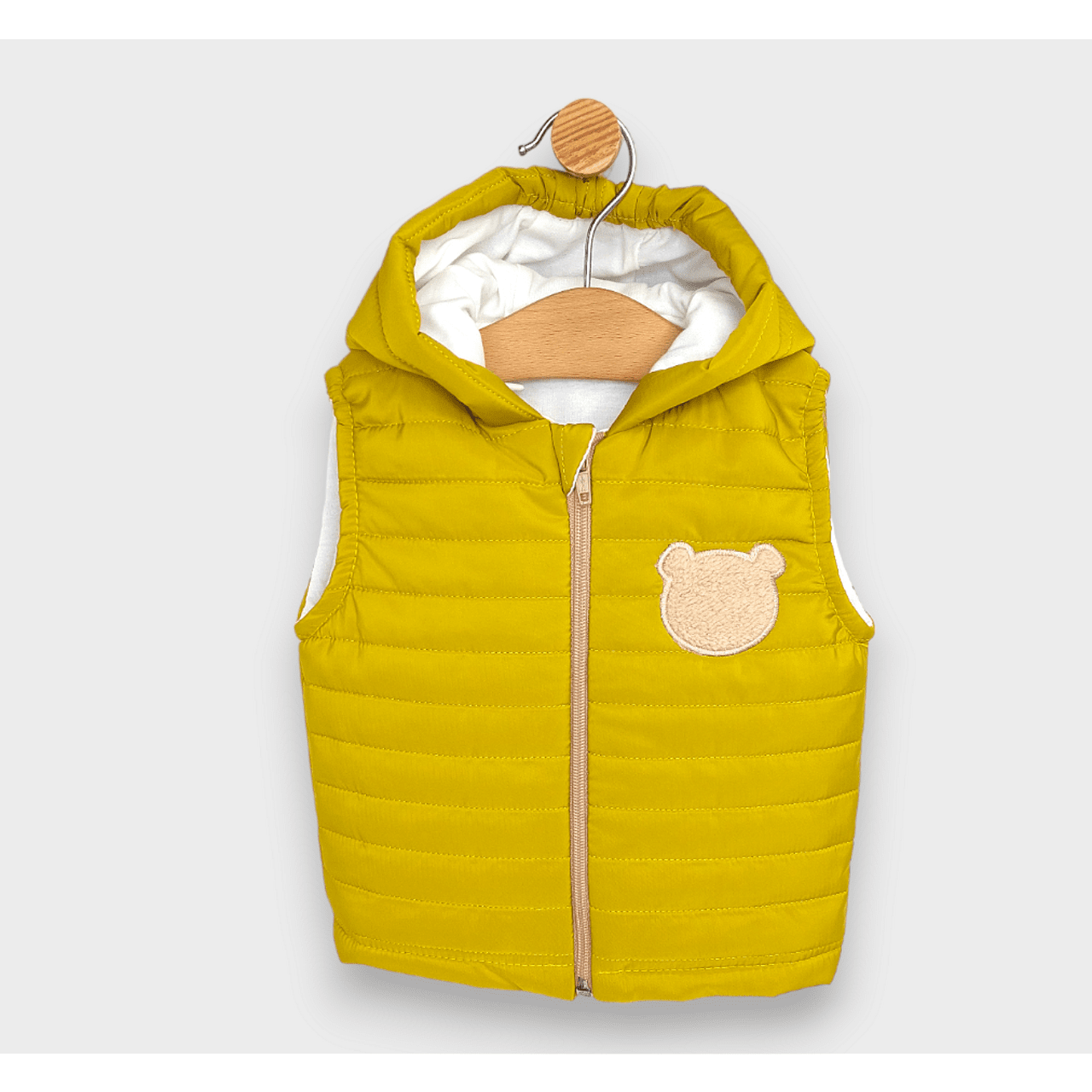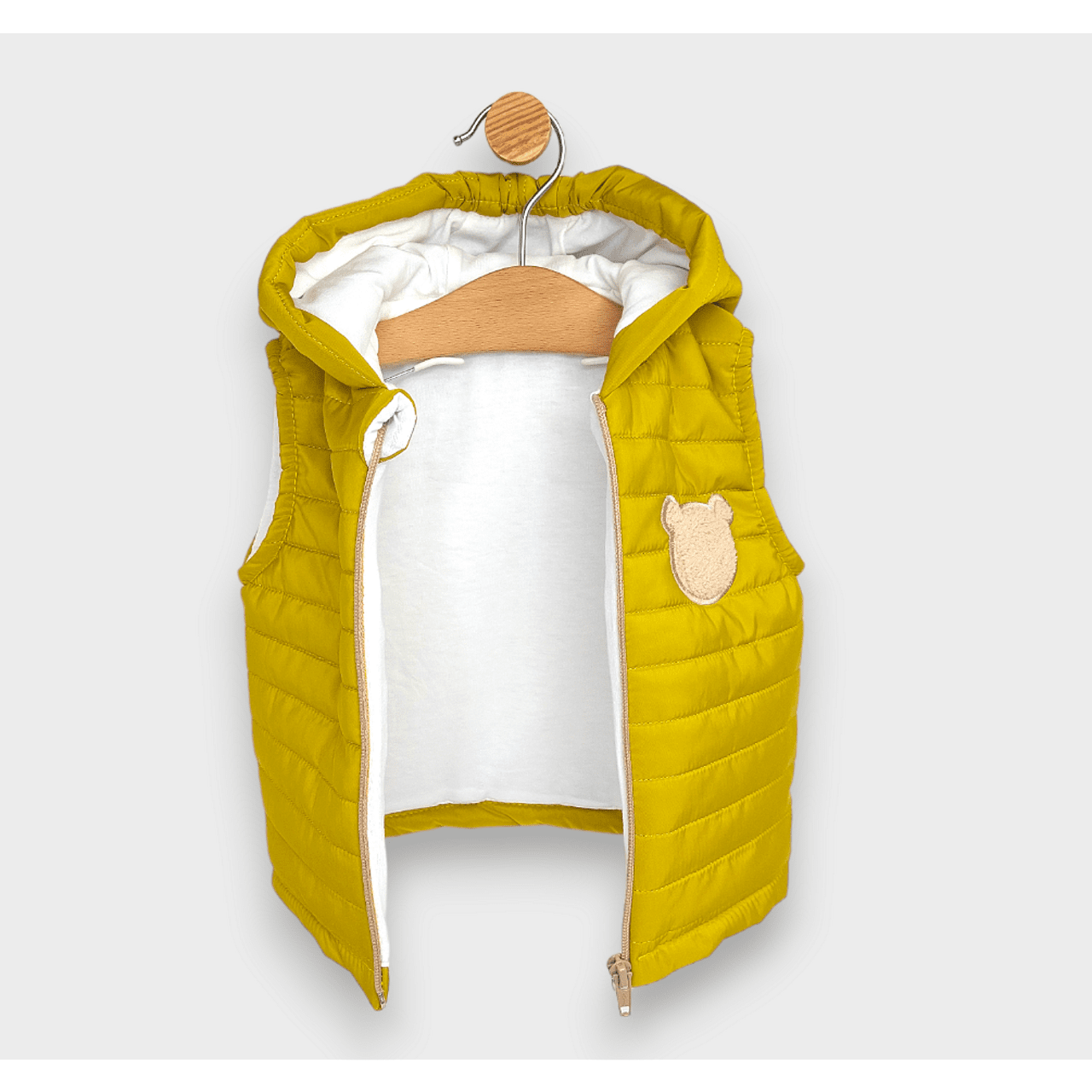 Бебешка ватирана грейка с качулка Пухено мече с ципче в цвят горчица. Свободна и удобна кройка, от мека и лека метирия. Грейката се комбинира чудесно с всеки тип дрехи. С весела и закачлива бродерия.