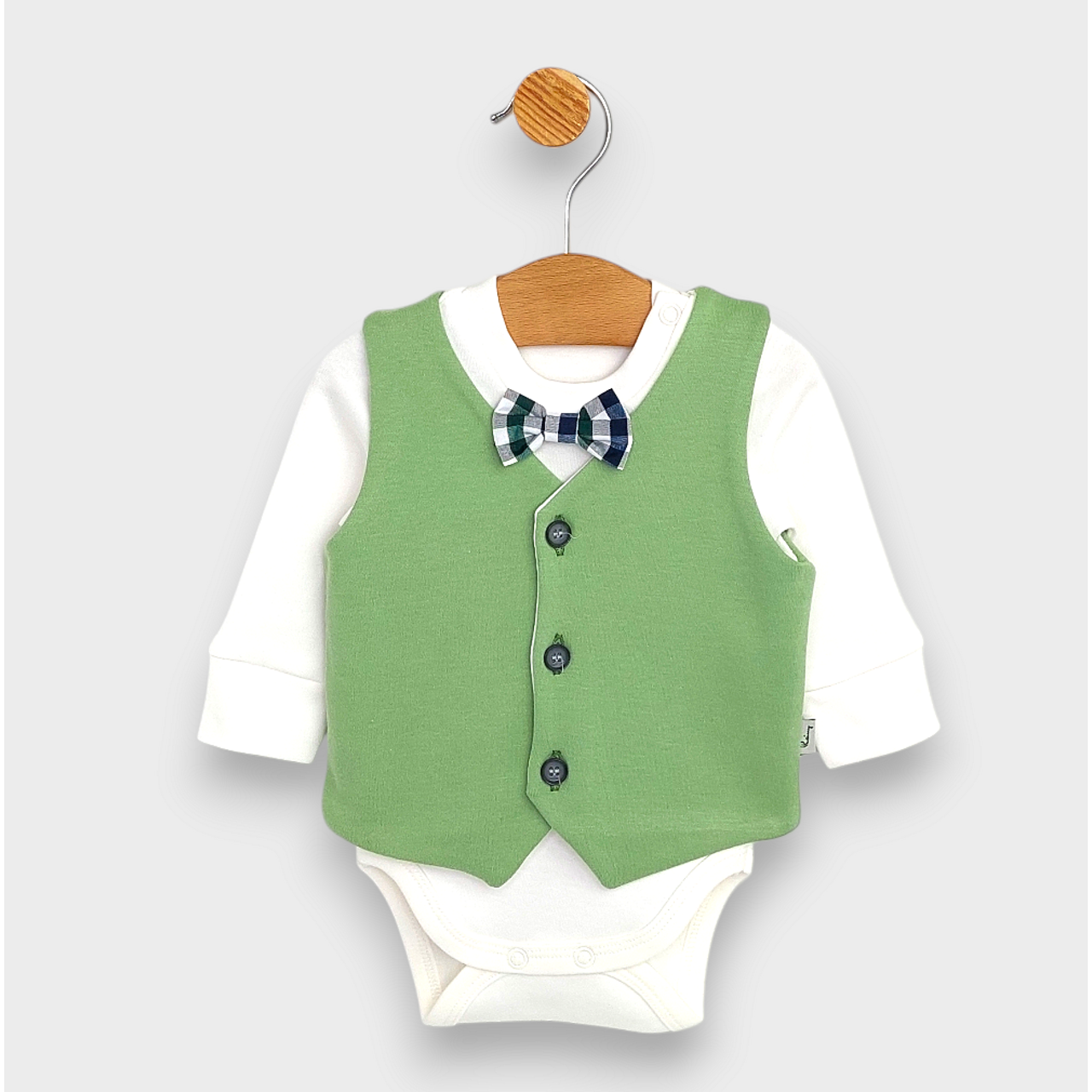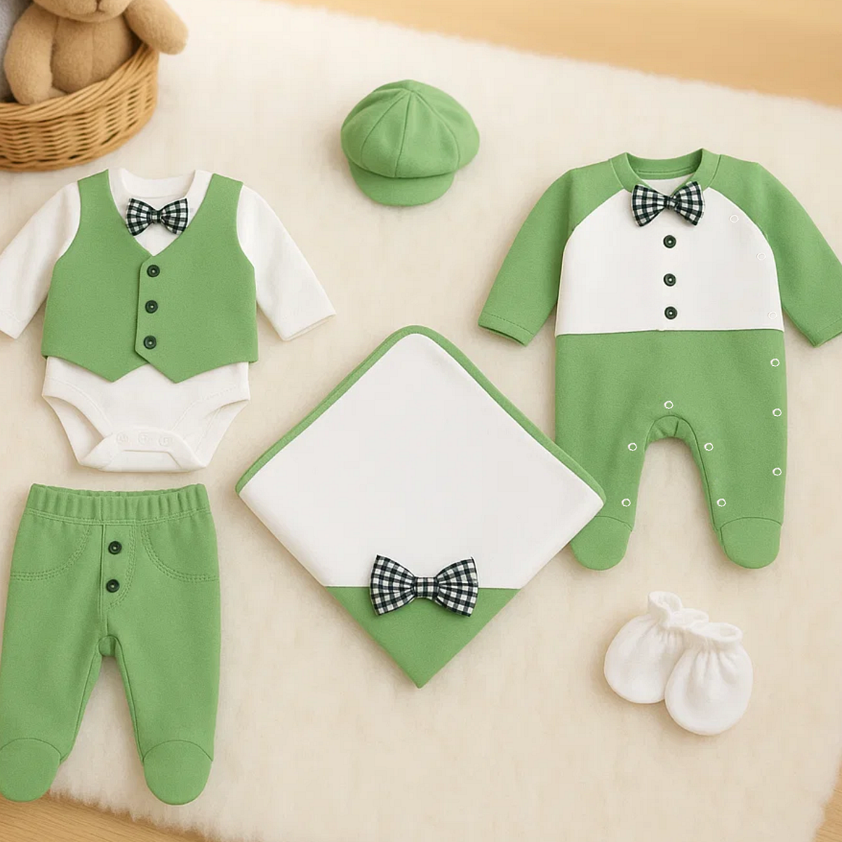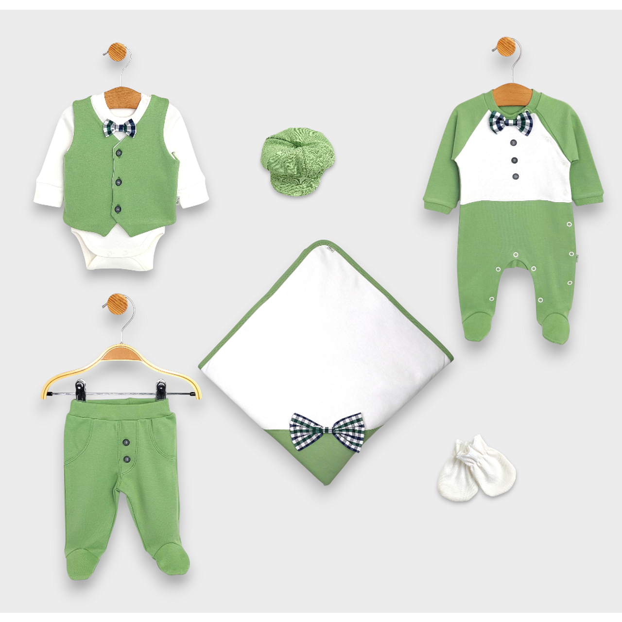 Този ексклузивен комплект включва всичко необходимо за новороденото, поднесено с нежност и внимание към детайла. Създаден от висококачествени материали, той осигурява мекота и уют, които кожата на Вашето бебе заслужава. Седемте части на комплекта са изработени с любов и мисъл за малките ангелчета, които ще ги носят.