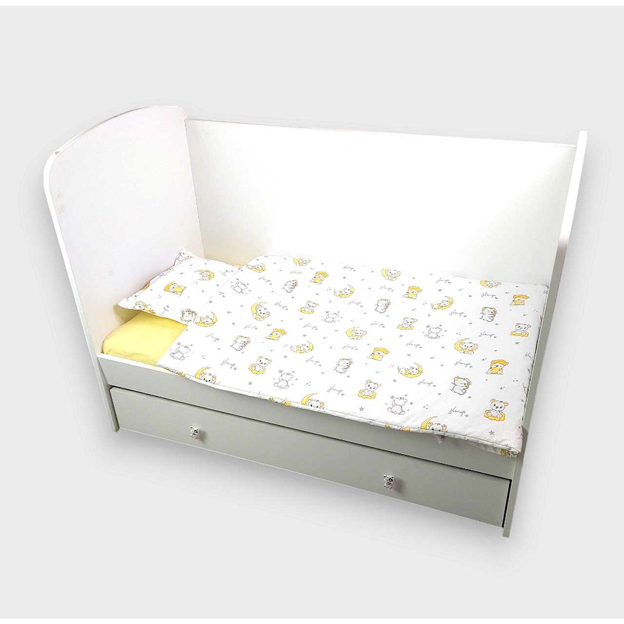 Бебешки спален комплект Мече на жълта луна е изработен от висококачествени материали в свежи цветове, които да внасят уют в детската стая. Дизайнът е стилен и оригинален. Комплекта ще пренесе малкото Ви съкровище в света на приказните сънища с лекота.