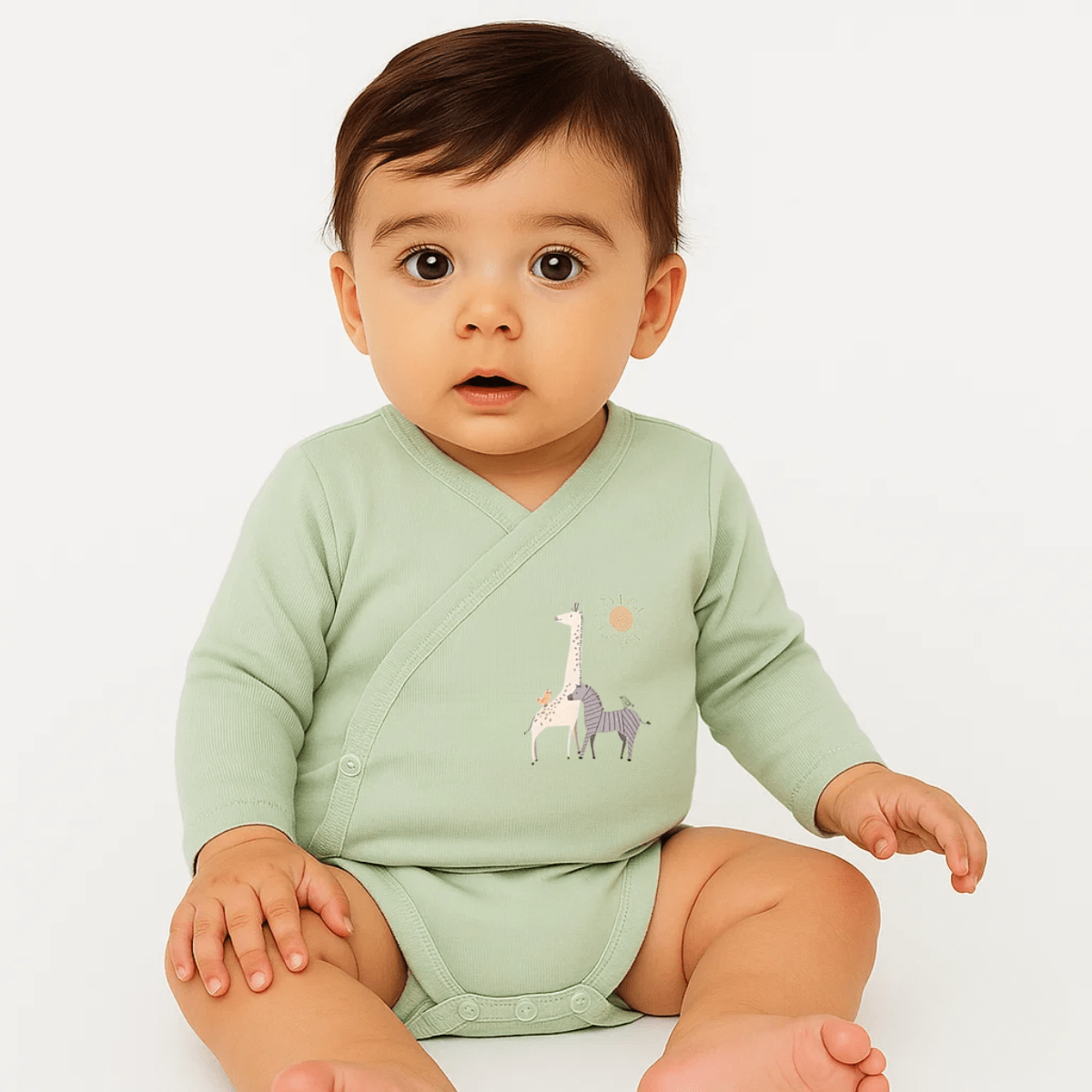 Бебешко боди за новородено Жираф и зебра с дълъг ръкав и странично закопчаване от нежна и мека материя в пастелни цветове. Удобно закопчаване, посредством тик-так копчета за лесна смяна на пелени. Изработена от 100% памучна материя, щадяща деликатната бебешка кожа. Бебешкото боди се предлага от новородено до 9 месечна възраст. Произведено от българския бранд Rainy.