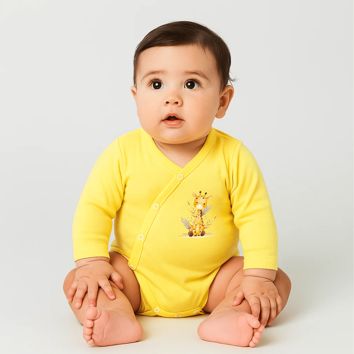 Бебешко боди за новородено Сладко жирафче с дълъг ръкав и странично закопчаване от нежна и мека материя в пастелни цветове. Удобно закопчаване, посредством тик-так копчета за лесна смяна на пелени. Изработена от 100% памучна материя, щадяща деликатната бебешка кожа. Бебешкото боди се предлага от новородено до 9 месечна възраст. Произведено от българския бранд Rainy.