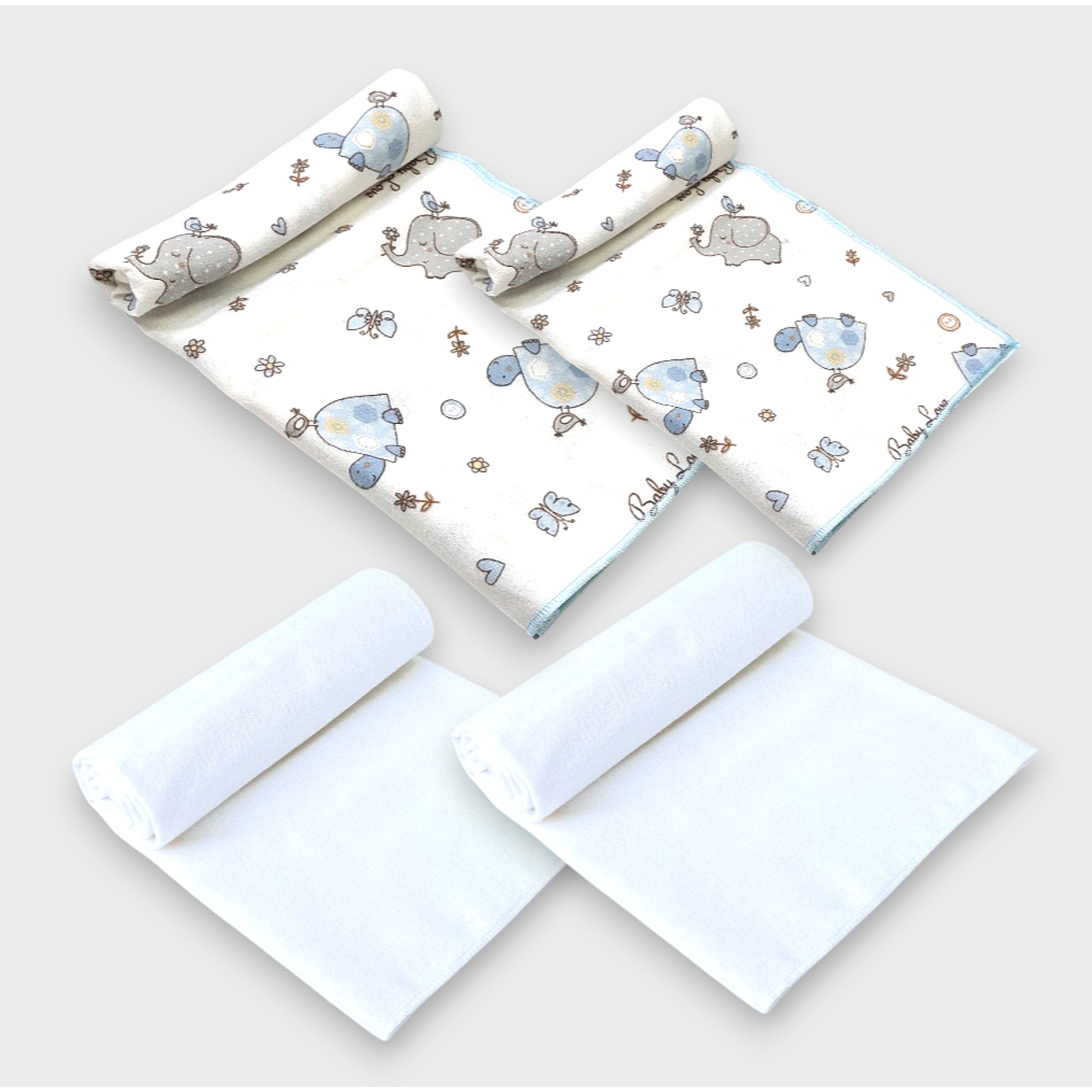 Комплект памучни пелени за бебе Бархет и Тензух 4 бр. Сини зебри и слончета ще ви са необходими още от първите дни на бебето. Може да се слагат на подложката за преповиване, като предпазна пелена между бебето и околния свят през първите месеци, като завивка през летните дни, по време на къпане, както и като защита върху коша за новородено или седалката на количката. Бебешките пелени са изработена от мека и деликатна памучна материя. Декорирана с нежен принт, от трайни и безопасни бои. Подходяща както за вкъщи, така и за разходка навън.
