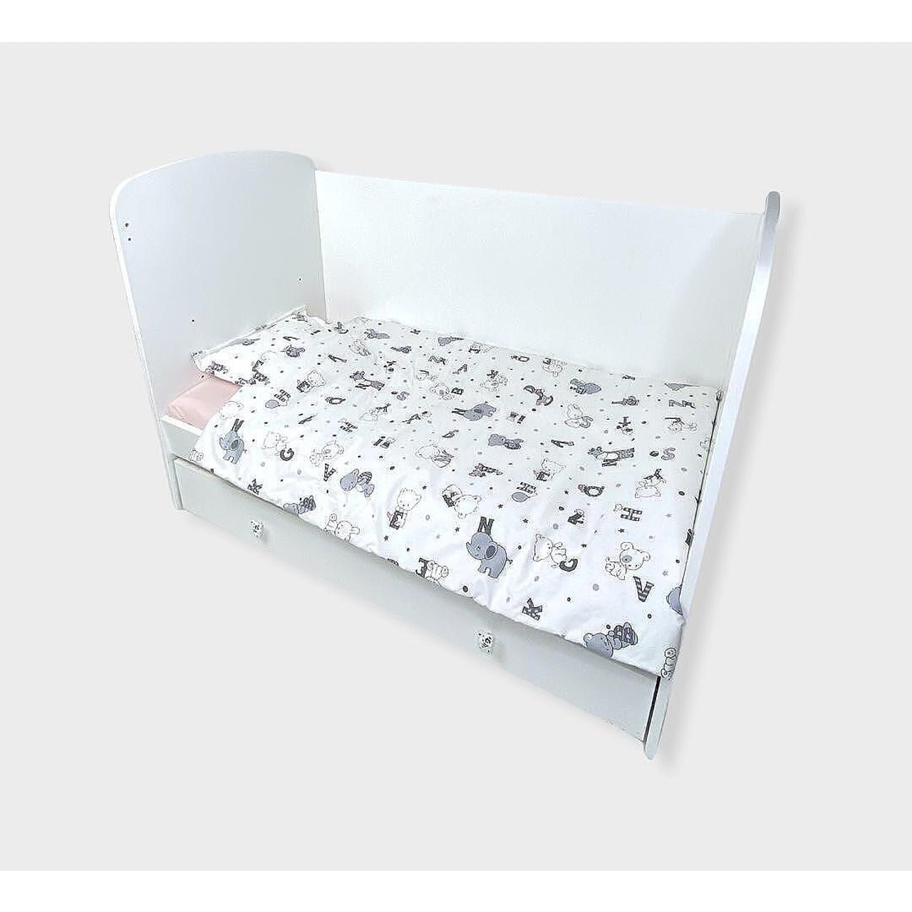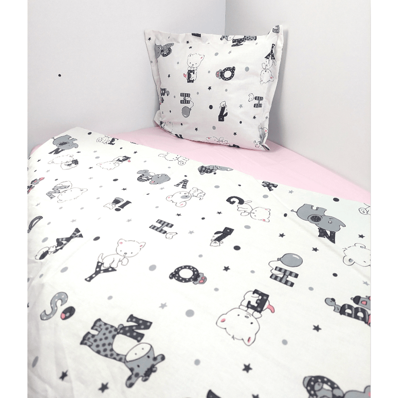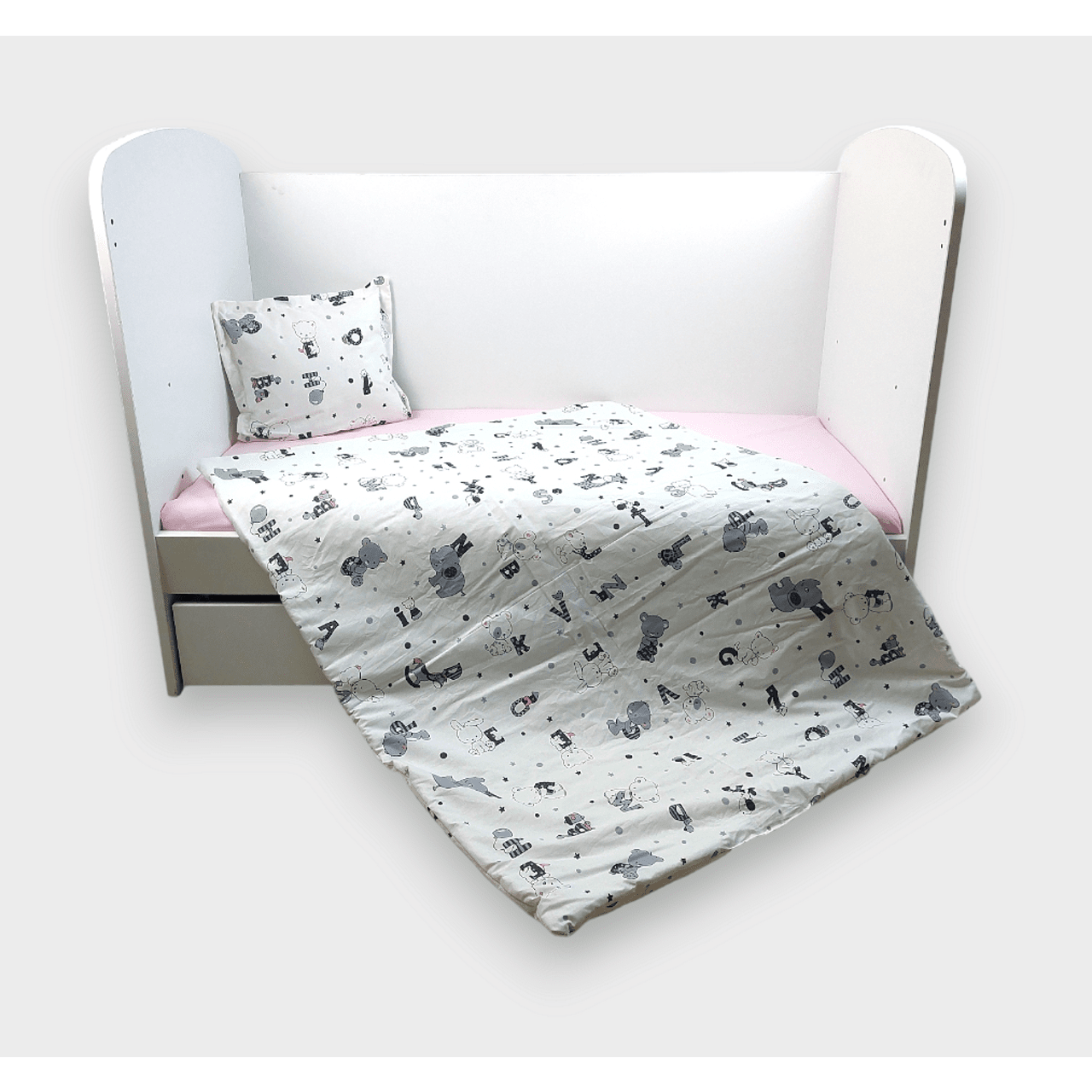 Бебешки спален комплект Мече с букви е изработен от висококачествени материали в свежи цветове, които да внасят уют в детската стая. Дизайнът е стилен и оригинален. Комплекта ще пренесе малкото Ви съкровище в света на приказните сънища с лекота.