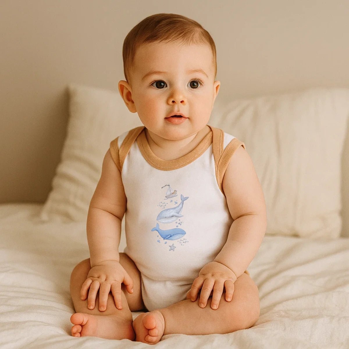 Rainy Бебешко боди потник Whales 56 - 80см. бял/мока