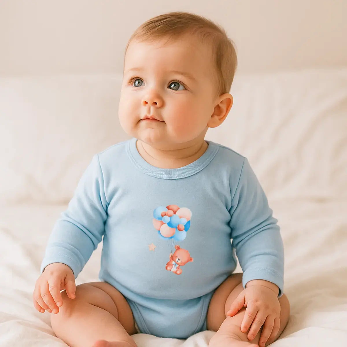 Бебешко боди с дълъг ръкав Мече с балони син от нежна и мека материя в пастелни цветове. Удобно закопчаване, посредством тик-так копчета за лесна смяна на пелени. Изработена от 100% памучна материя, щадяща деликатната бебешка кожа. С весела и закачлива картинка. Бебешкото боди се предлага от новородено до 4 месечна възраст. Произведено от българския бранд Rainy.