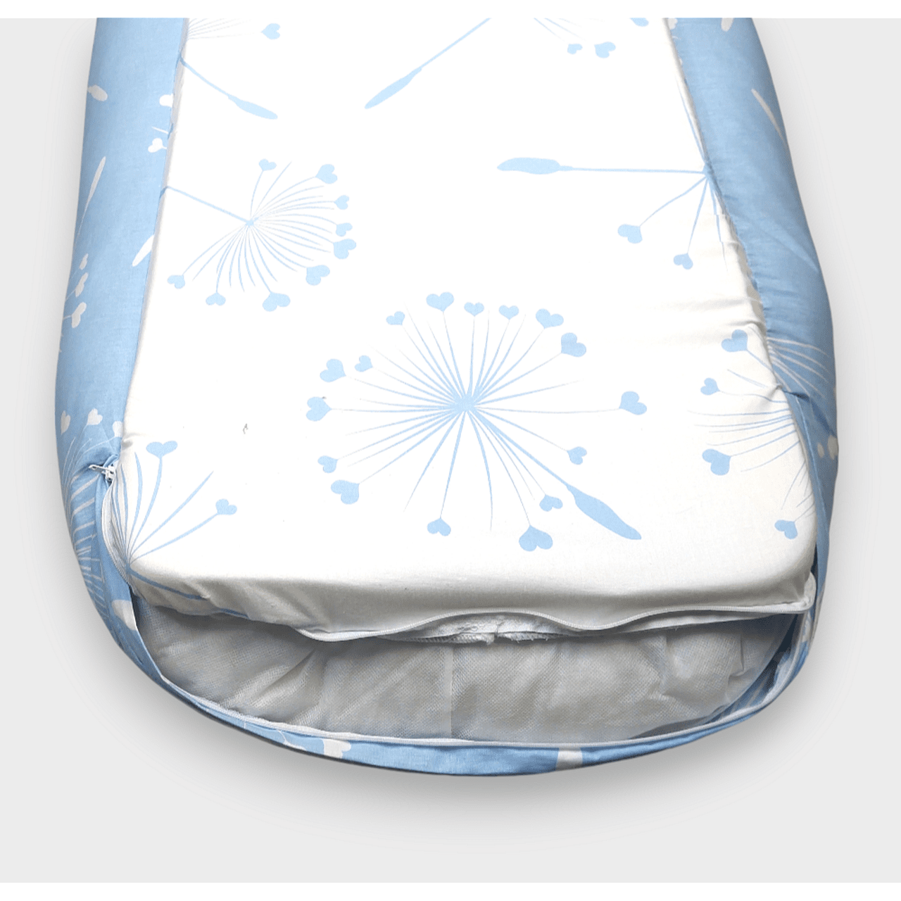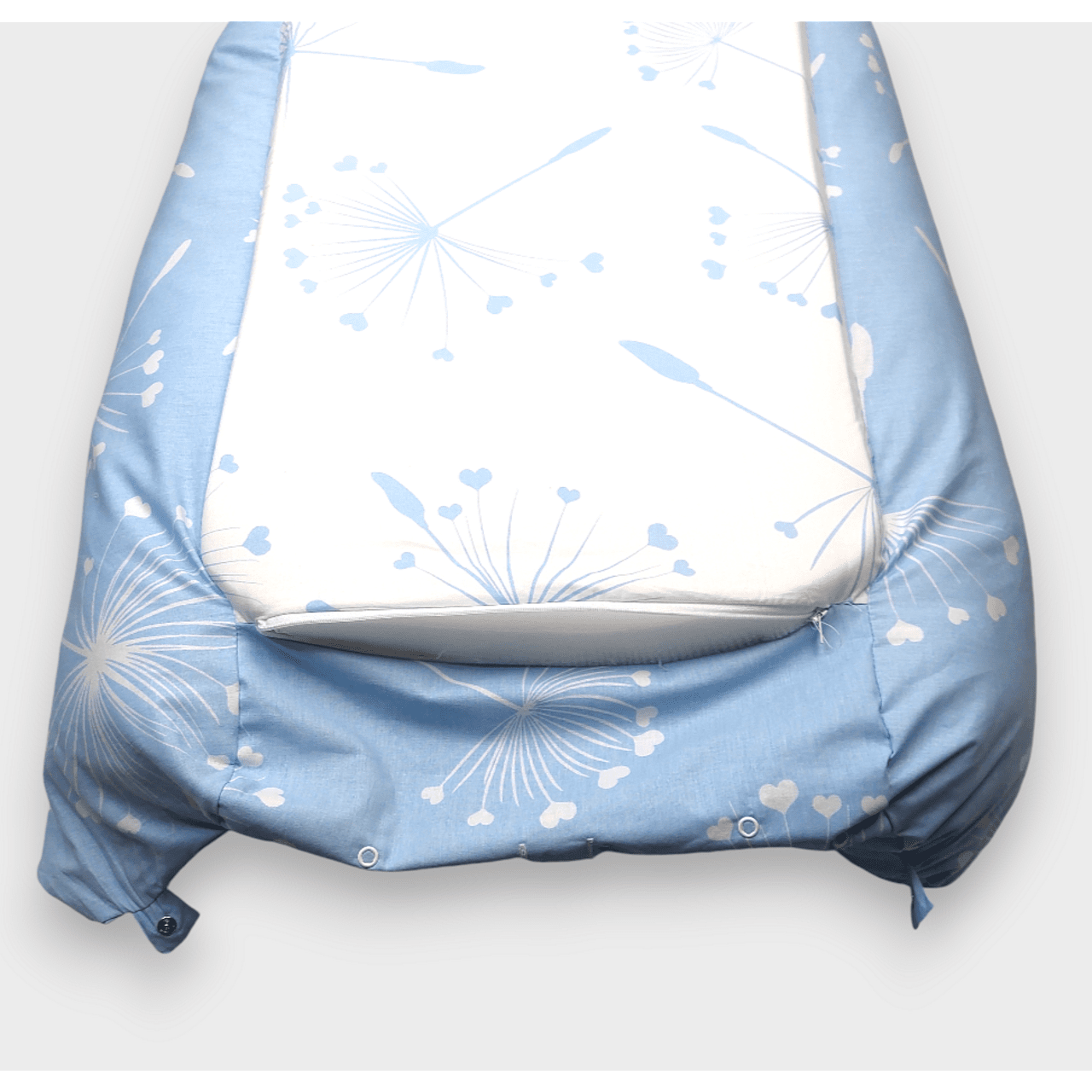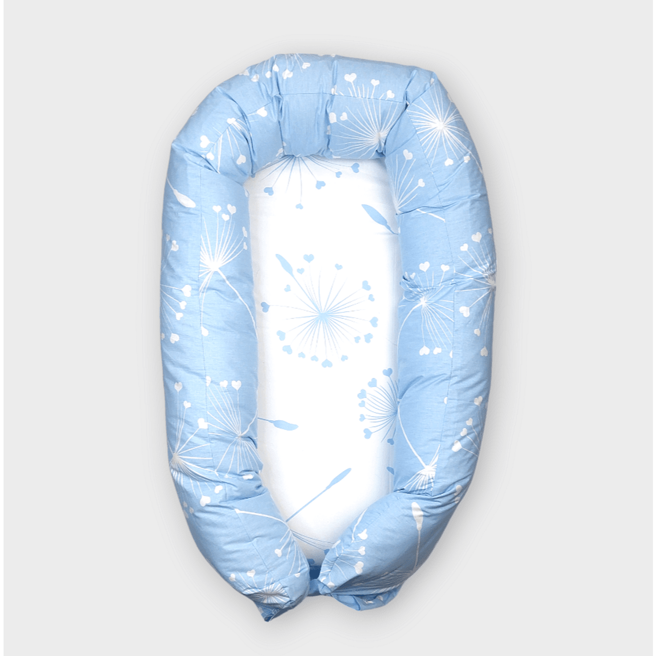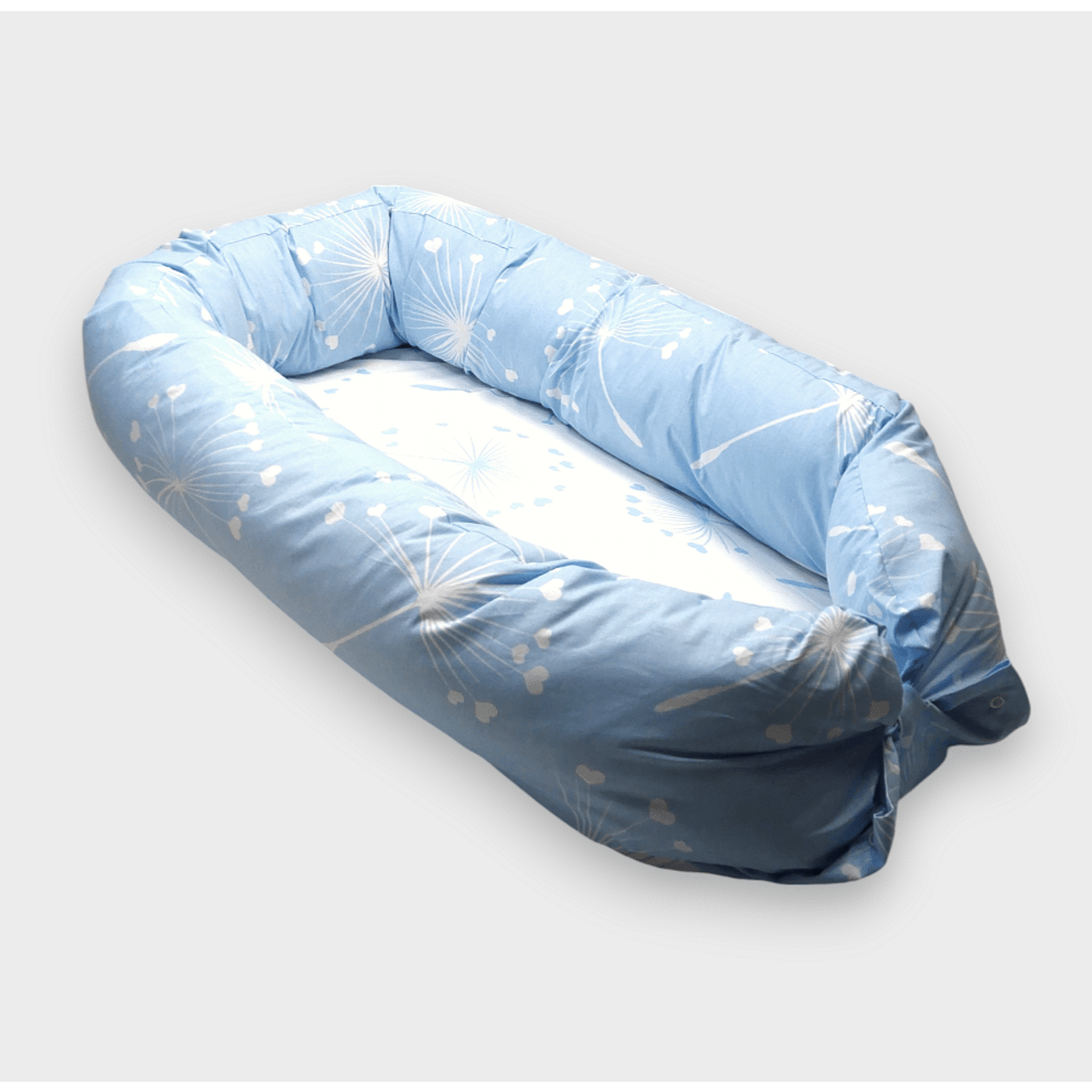 Това бебешко гнездо е създадено с мисъл за комфорта и безопасността на новороденото, като предлага меко и защитено пространство за сън и почивка. Изработено от висококачествени материали, то гарантира нежно докосване до кожата на бебето и спокойствие за родителите. Със своята очарователна визия на сини глухарчета, гнездото добавя цветен акцент във всяка детска стая.