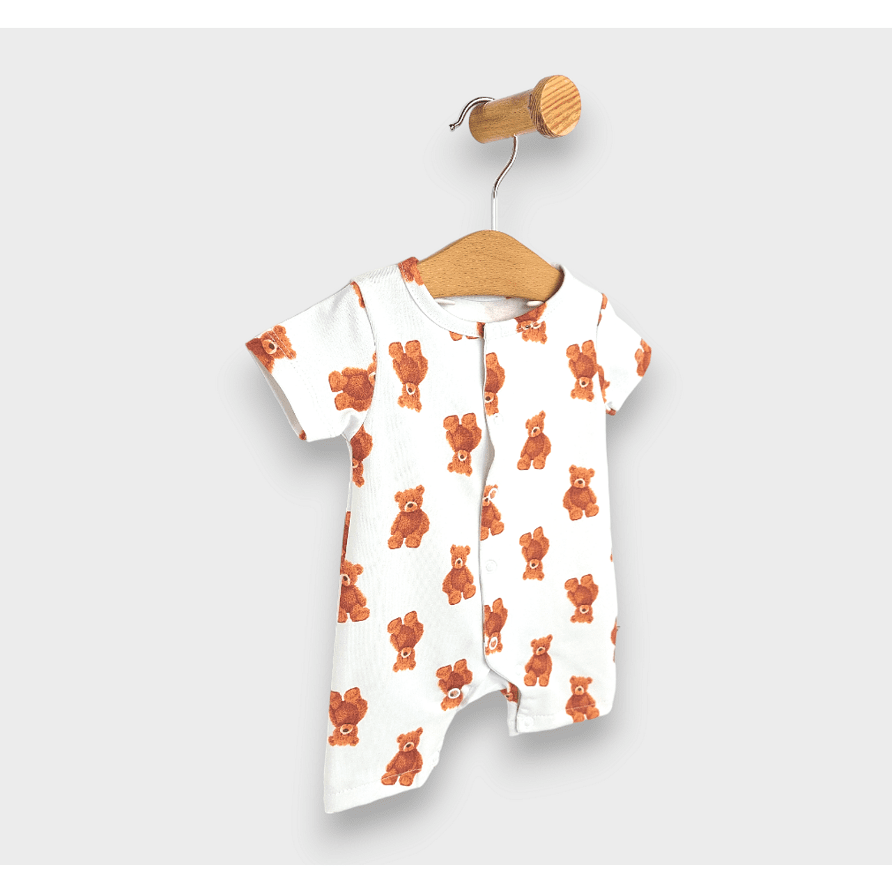 Изработен от нежни към бебешката кожа материали, този гащеризон е създаден да предложи максимален комфорт през целия ден. Шармантният дизайн с игриви мечета добавя вълшебство към всекидневието, а цветът носи слънчево настроение дори в най-сивите дни. Късите ръкави гарантират свобода на движение и прохлада през топлите месеци, а удобните копчета улесняват смяната на пелените, правейки гащеризона практичен избор за активните родители.