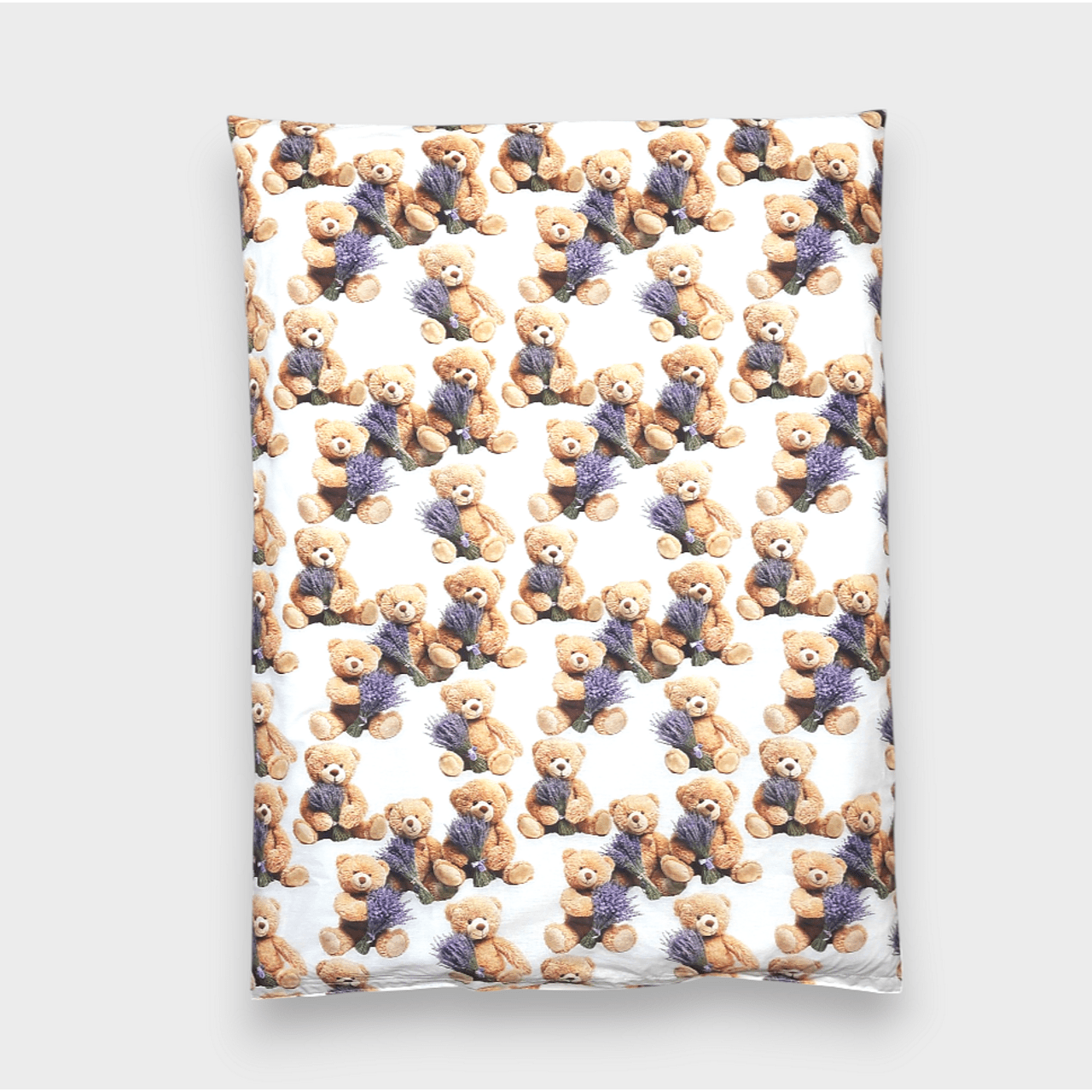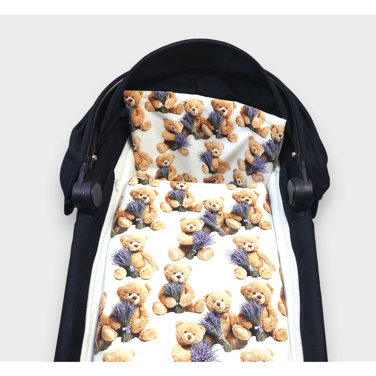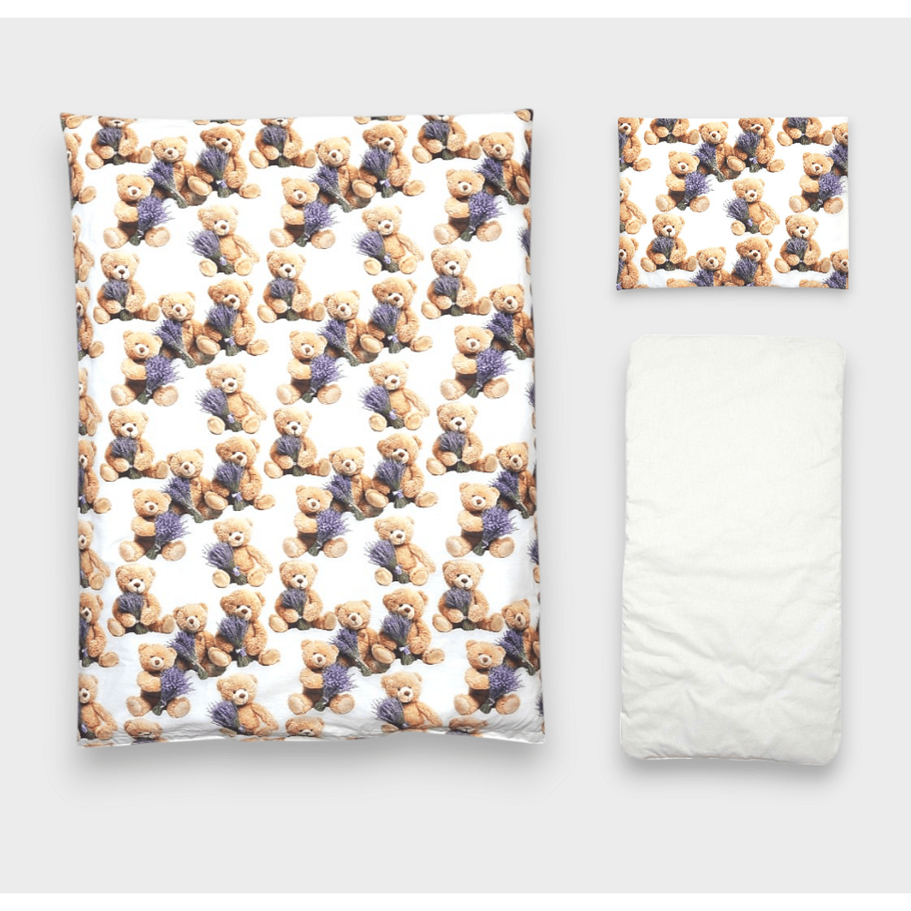 Съставен от четири части, комплектът включва всичко необходимо за сладките сънища на вашето дете. Изработен от висококачествени материали, той осигурява оптимална мекота и дишаща структура, която предотвратява прегряване. Дизайнът с 5D мече и лавандула не само че е визуално привлекателен, но и носи успокояващ аромат, който помага на бебето да се отпусне.
