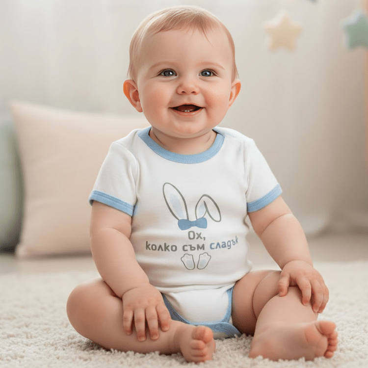 Rainy Бебешко боди с надпис Ох, колко съм сладък и къс ръкав от нежна и мека материя в пастелни цветове. Удобно закопчаване, посредством тик-так копчета за лесна смяна на пелени. Изработена от 100% памучна материя, щадяща деликатната бебешка кожа. С весел и закачлив надпис. Бебешкото боди се предлага от новородено до 18 месечна възраст. Произведено от българския бранд Rainy.