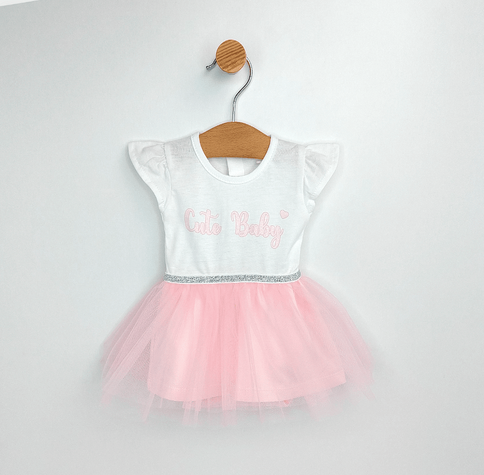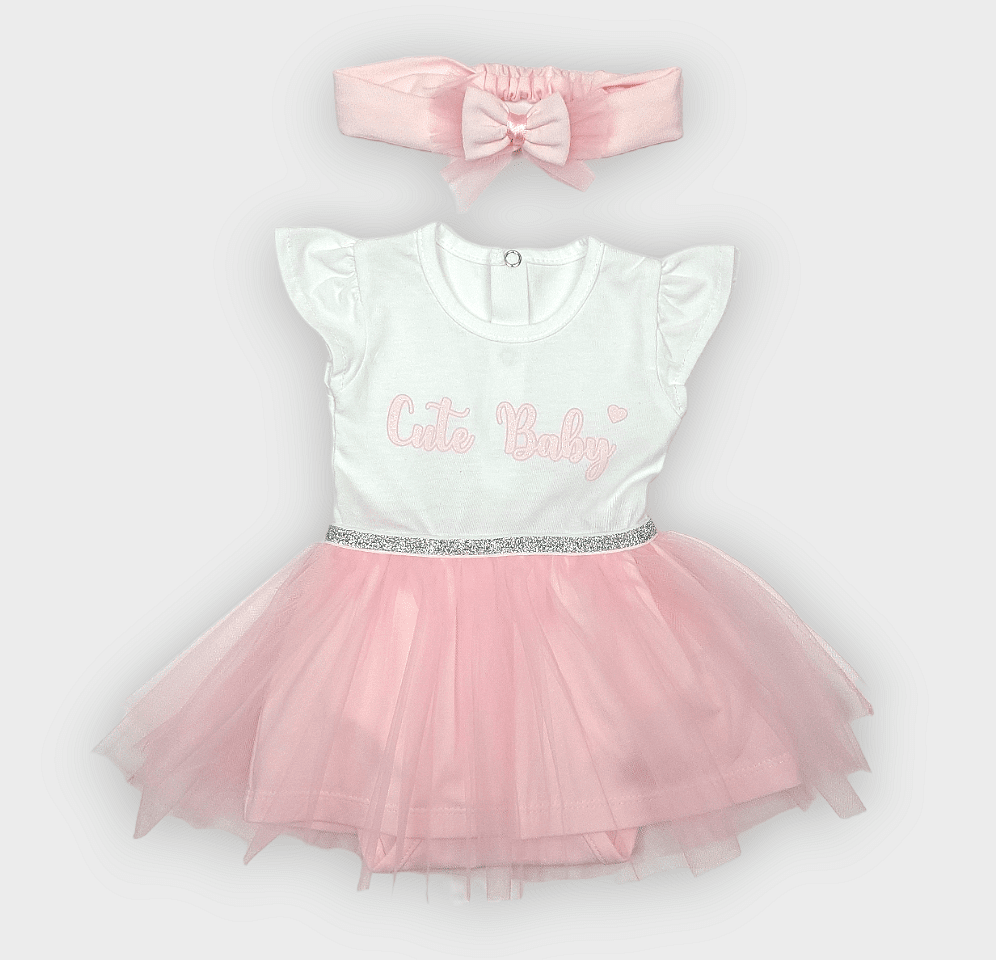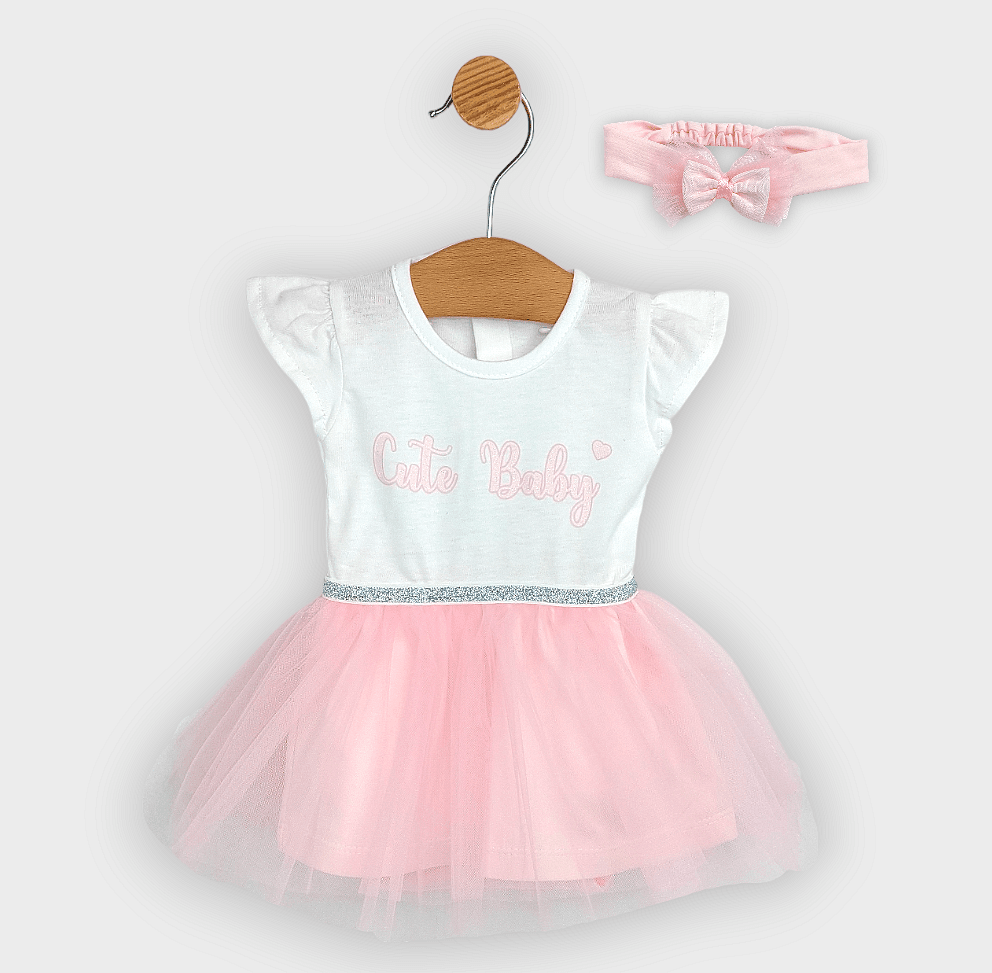 Разкошна бебешка боди - рокля Cute Baby за момиче от 0 до 12 месеца в нежни цветове. Горната част на роклята е с къси ръкави. Елегантна и практична бебешка боди-рокля с диадема, подходяща както за ежедневието, така и за специален повод.